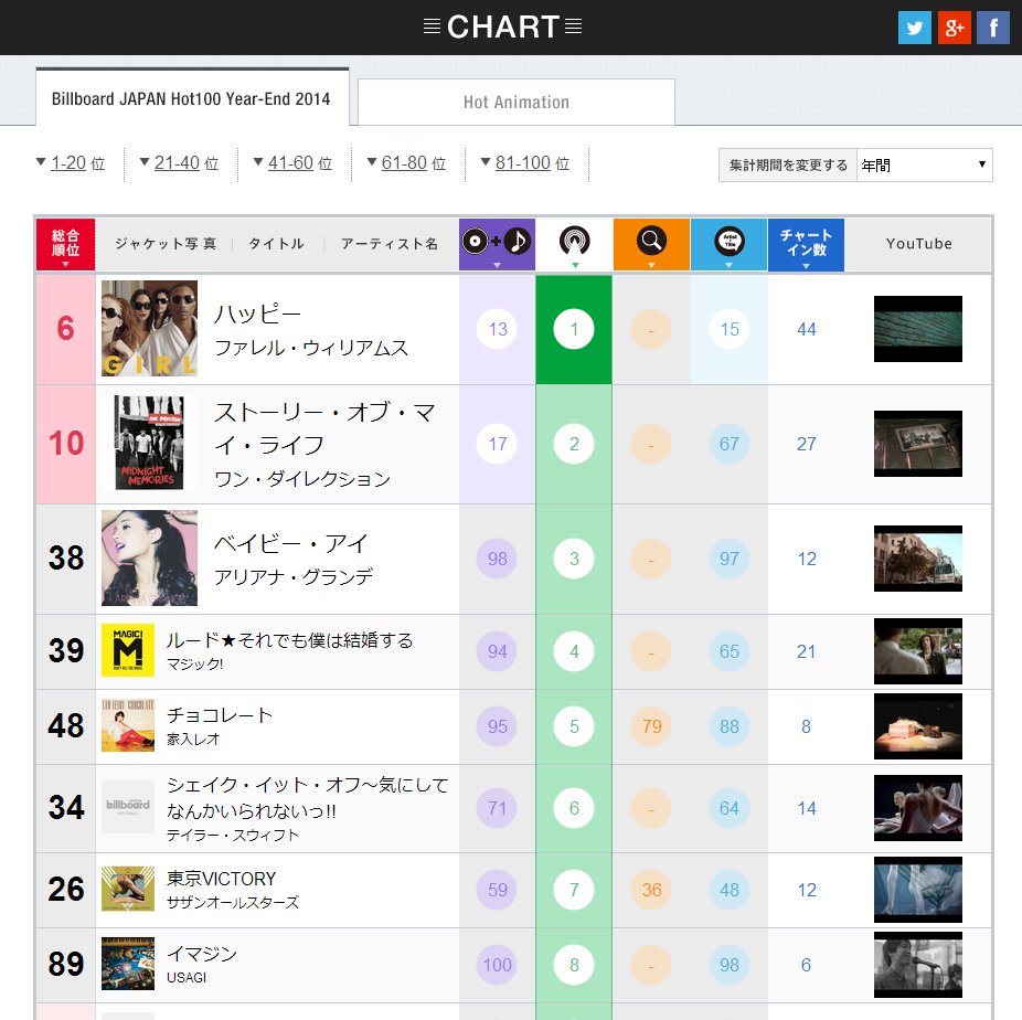 そこで、今回のビルボードHOT100の年間チャートです。「ラジオオンエア回数のエアプレイ順」(ちょっと日本語がややこしいですね)というボタンでソートをかけてみれば、1位はファレル・ウィリアムスの「ハッピー」。以下、ワン・ダイレクション、アリアナ・グランデと当代の人気「洋楽」アーティストが並んでいる。7位のサザンオールスターズの健闘も光る。