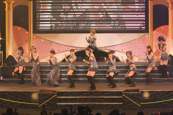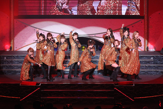 4月より【ドリームモーニング娘。 コンサートツアー2011 春の舞 ~卒業生 DE 再結成~】と題した全国ツアーを敢行中の彼女たち。この日もキラキラしたゴールドの衣装に身を包んで登場した10人は、序盤から『LOVEマシーン』『抱いてHOLD ON ME!』などの大ヒットナンバーを連発し、抜群の一体感を見せるオーディエンスと共に会場の熱気を上昇させていきます。
