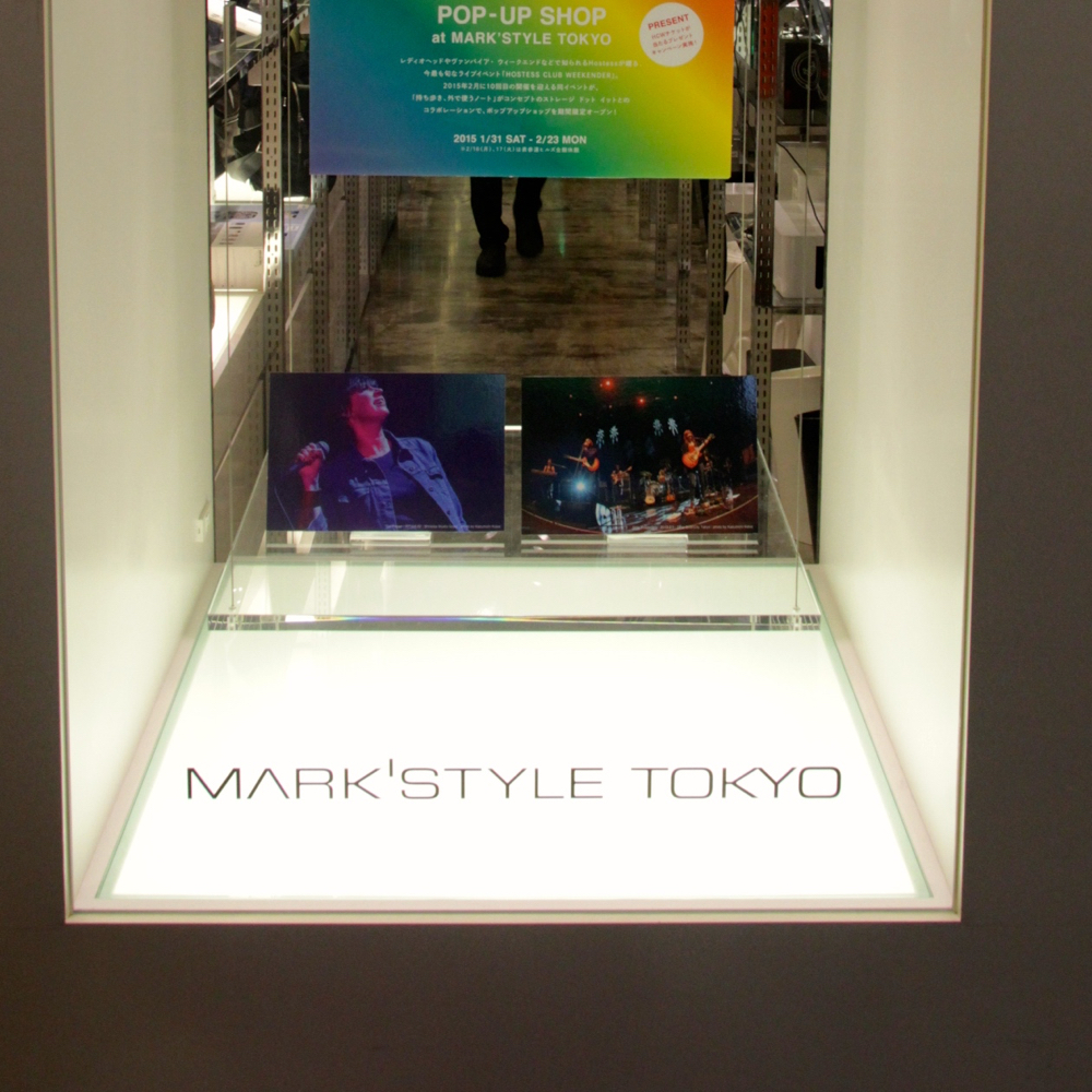 表参道ヒルズのB3Fに構える「MARK'STYLE TOKYO」。現在は、「TOGAKURE」という商品が店頭に大きく展開されています。入口横には今回のポップアップショップのディスプレイも用意。ダーティー・プロジェクターズのライブ写真も展示。また来日公演して欲しいものですね。