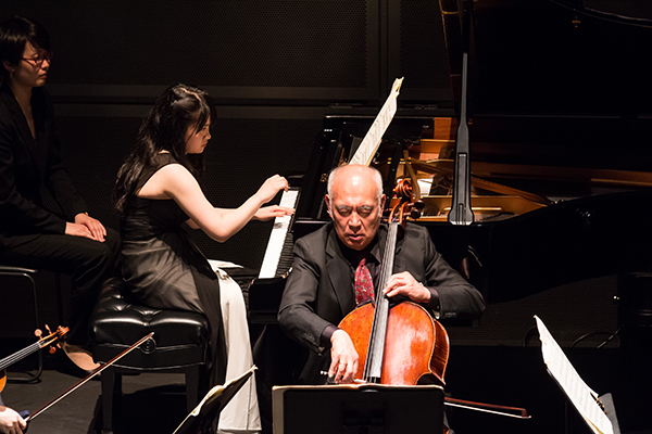 メシアンによる「世の終わりのための四重奏曲」に、日本の音楽界を長きにわたり牽引している堤剛(チェロ)と、成田達輝(ヴァイオリン)、吉田誠(クラリネット)、萩原麻未(ピアノ)という若き才能たちが挑んだ。本作は、メシアンが第二次世界大戦中、ナチス・ドイツの捕虜として収容されている際に作曲し、初演も収容所で行ったという非常に珍しい状況下で生まれた作品。同じ収容所に居合わせた音楽家たちと演奏するために作曲されたことから、チェロ、ヴァイオリン、クラリネット、ピアノというレアな編成で作られた。会場の中央にスポットライトが落ちると、張りつめた空気の中、吉田のクラリネットによる朝を告げる鳥の声で始まった。4人は互いに、色鮮やかで変化に富んだ音色を響かせ、客席もどんどん熱を帯びていく。第8曲「イエズスの不滅性への頌歌」で成田のヴァイオリンの音が消えてからも、会場内は興奮と静寂の入り混じった空気で、しばし満たされた。ホールD7の最終公演で22時を回っていたにも関わらず、拍手は鳴り止むことはなく何度もカーテンコールが続けられた。