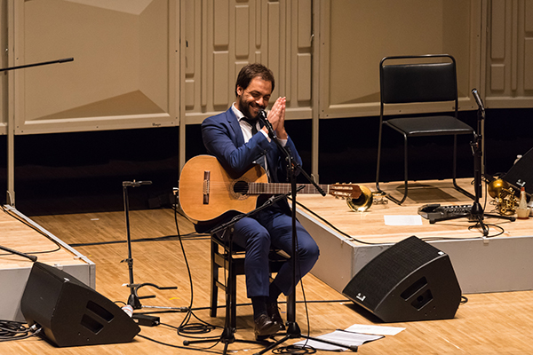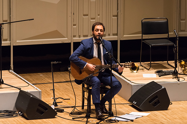 ヴェルヴェットのような歌声を持つと称される、ファド歌手アントニオ・ザンブージョ。ポルトガルの民族歌謡ファドに、ボサノヴァ、アルゼンチンタンゴ、現代的要素がミックスされた独自のサウンドが、多くのファンとアーティスト達を捉えて放さない。ファドに無くてはならないポルトガル・ギターの鈴を鳴らすような明るい音色は、小気味よいアクセントとなって歌声に寄り添う。トランペットはまるでホルンやサックスかと思わせるほど柔らかくコントロールされ、ウッド・ベースは弦・打楽器として歌に寄り添う身体性を感じさせ、クラリネットは雄弁にして清楚な木の暖かみを感じさせるなど、手練れのバンド・メンバー達による信頼感抜群のサポートで、安心してそのサウンドに身をゆだねられた。ラスト近く、ザンブージョがギター片手に、口笛とつぶやくような声で始めた小さなうたが、最後は完全に会場を巻き込んで「全員の」音楽にしてしまったのはまるで魔法の様な光景だったと付け加えておきたい。
