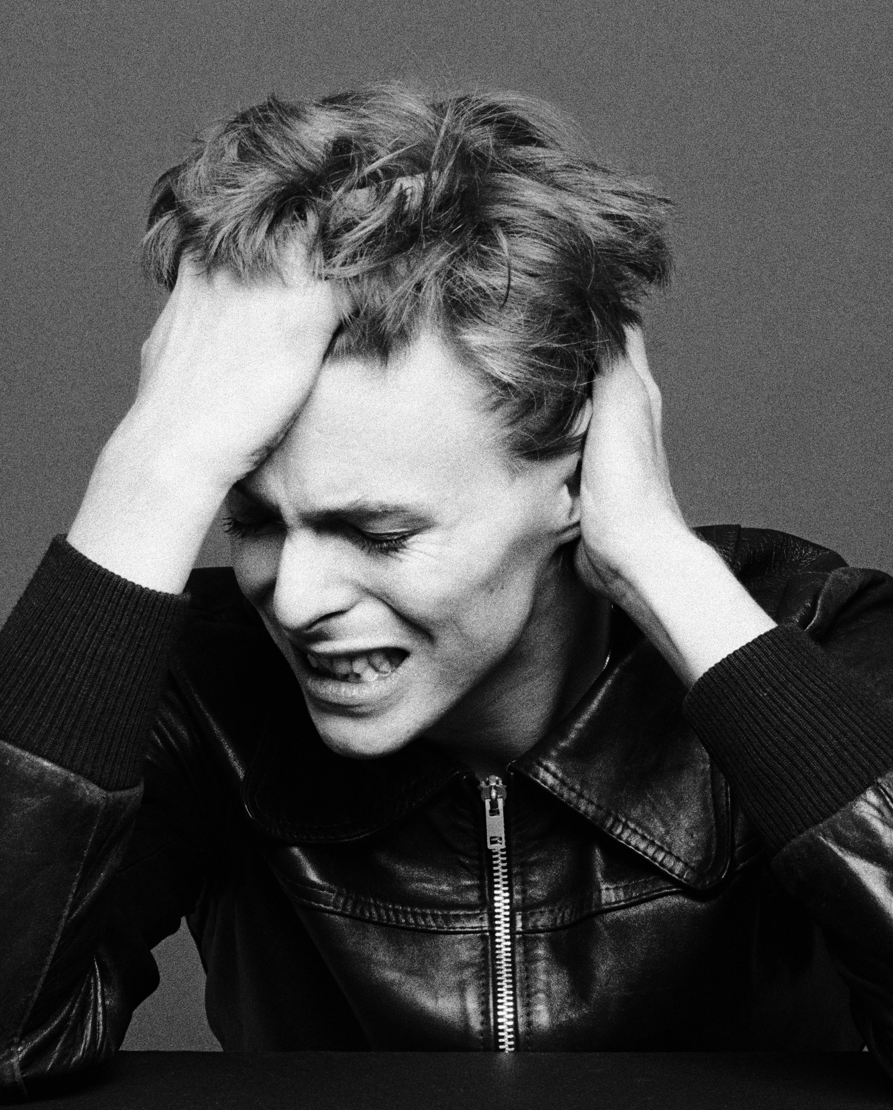 鋤田正義:彼らとしてもプロモーションの一環としてオーケーしてくれたんだと思うけど、ボウイとイギー・ポップでひとり1時間ずつ撮れることになってね。で、ちょうどいいスタジオが見つからなくて知り合いの小さなところを使わせてもらったら、逆にそれがいいムードになりましたね。ボウイを先に撮ったんだけど、イギー・ポップも僕の近くにいて、ボウイに冗談を言ったりするんですよ。ボウイもそれを聞いて笑ったりして、すごく和やかで、その空気が良かった。コンセプトもなかったし、何をどう撮ろうっていう打ち合わせもまったくなくて、ヤッコさんにも来てもらったんだけど、ボウイが衣裳のことでひとつだけ指示したのは“革ジャンを数点持ってきてくれ”と。それだけですよ。あとはとにかく1時間もらって、こっちが撮りたいように撮ろうと。イギー・ポップが横にいて、ボウイはヤッコさんが持ってきた革ジャンを1枚だけ着たり、重ねてみたりね。最初はきっちりキメるんだけど、少しずつ何かやり出すのがボウイのおもしろいところで、例えばヘアスタイルも最初はメイクさんが整えた形でいくけど、だんだんクシャクシャにする。僕もそれを逃さないようにどんどん撮りましたね。そういうフォト・セッションはあとにも先にもあまりなくて、壊していくおもしろさっていうか、こっちがこう撮りたいって作っていく余裕はなくて、カメラの前で彼が演じるのを撮っていく。彼に合わせてどんどんシャッターを切っていくだけでね、無我夢中の1時間でしたよ。