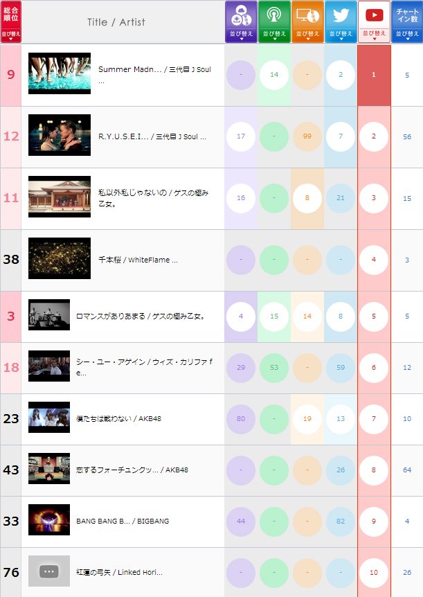 ??今度はラジオのランキングでソートしたものとYouTubeでソートしたランキングを比べてみると、いかがでしょう?