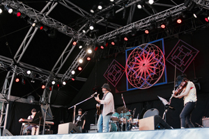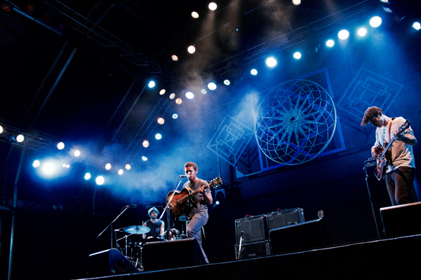 この日の<RED MARQUEE>大トリは、今アイスランドで最も勢いのある若手バンド、オブ・モンスターズ・アンド・メン。北欧的な冷たい空気が張り詰めたステージと今か、今かとメンバーの登場を待ちわびるテント内の熱気との温度差がまさにピークに達した瞬間にステージ上にメンバーが。オープニングは、最新作『ビニース・ザ・スキン』の中でも一際ダークでムーディーな「Thousand Eyes」。日本を意識した(?)オリエンタルなガウンを身に纏った紅一点のナンナが豪快に叩くフロアタムの鼓動とストリングスの音色が絡み合い、壮大なサウンドスケープが描き出されていく。テントいっぱいの観客を狂喜乱舞させた、彼らのブレイクのきっかけとなった「Little Talks」のみならず、新曲の「Empire」などでも、すかさず手拍子やシングアロングが沸き起こるのには驚かされたが、これぞOMAMのライブの醍醐味であり、生でしか体感できないオーディエンスの一体感と高揚感を存分に感じさせてくれた。
