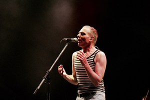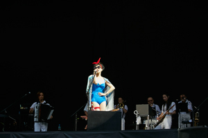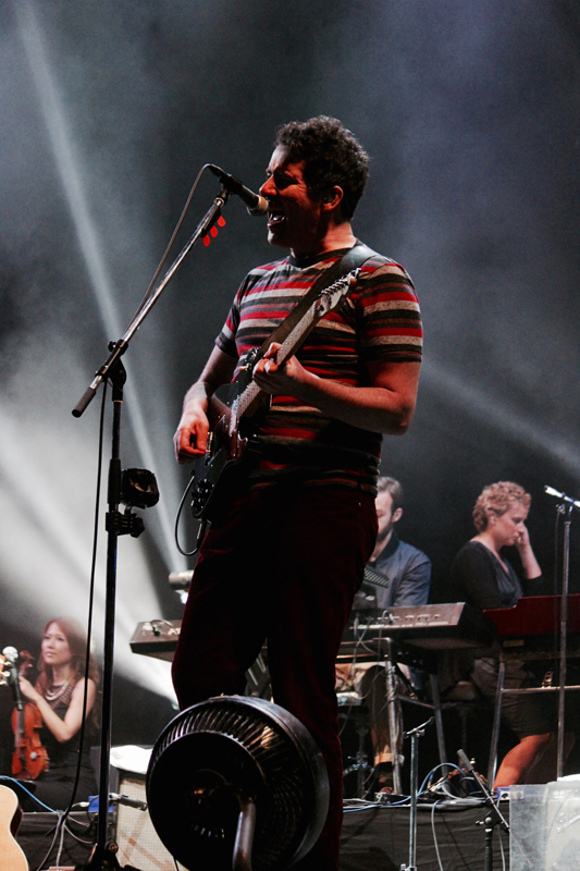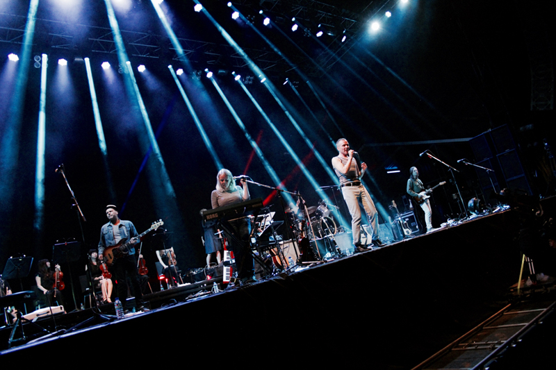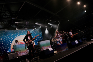 <WHITE STAGE>の音響を味方につけ、2月の来日公演を遥かに上回る、最高にハッピーでダンサブルなステージで多くのファンを魅了したベル・アンド・セバスチャン。サラが奏でる透明感溢れるフルートの音色とともに「Nobody's Empire」でライブがスタート、日本人ストリング隊&トランペット奏者も絶妙なエッセンスを加えている。2曲目の「I'm a Cuckoo 」では、早くもジャケット脱ぎ捨て、ボーダーのタンクトップ姿(荷物をなくされて、東京のH&Mで調達したそう)で軽快なステップを踏むスチュアートとともにオーディエンスも思い思いに小躍りしながら、「I'd rather be in Tokyo~、Watch the Sunday gang in Harajuku~」のコーラスをシングアロング。新作がダンス・ミュージックに傾倒した作品ということもあり、日本では超久しぶりの「Electronic Renaissance」も披露され、<WHITE STAGE>は巨大なダンスフロアと化す(スチュアートのクネクネダンスもこの日一番の仕上がり)。「Lord Anthony」の途中で観客の中に飛び込んでいったスチュアートに帽子を被せ&マスカラを塗ってあげる場面や「The Boy With The Arab Strap」の観客をステージ上に呼び、一緒にダンスするお決まりのコーナーでは、ダンサーたちがスチュアートに再び帽子を被せ(今度は重ね帽)、眼鏡をかけ…完全に遊ばれてる。40代後半になっても、本当に“twee”を体現してるな~、スチュアート(もちろんいい意味で)と思いつつも、移り変わりの激しい音楽シーンの中で、デビュー当時からのエヴァーグリーンな輝きを失わない稀代な存在だというの改めて認識させられたマジカルなステージだった。