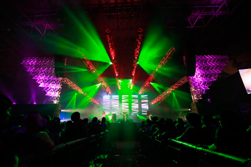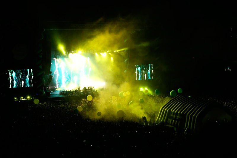 1日目のヘッドライナー、ケミカル・ブラザーズを一目見ようと、アリーナもスタンドもパンパンになるほどの人が集まったMARINE STAGE。ほぼ定刻にライブがスタートし、1曲目「Hey Boy Hey Girl」が流れ出すとオーディエンスの地響きのような歓声が響き渡った。会場ではスモーク、色とりどりのレーザーやライト、曲によって変わるバックモニターの映像、すべてが音楽と一体となり、ケミカル・ブラザーズの世界観を作り上げていた。「Do It Again」、「Go」、「Swoon」、「Star Guitar」と次々に代表曲をドロップし会場を大きく揺らせた。途中、スクリーンの映像の中でボールが飛び跳ねていると、会場に巨大なバルーンが出現したり、青と赤の巨大ロボットが現れ、目からライトを飛ばすなど曲以外にも様々な演出で観客を楽しませた。そしてラストナンバーは「Block Rockin’n Beat」。最後まで観客を踊らせる大満足のセットリストだった。、約1時間30分のステージで王者の貫録を見せつけ初日の幕は閉じた。