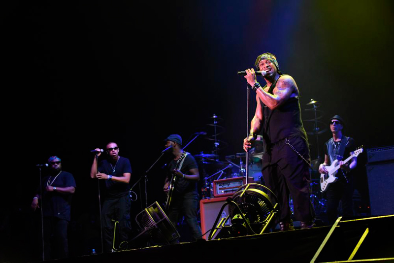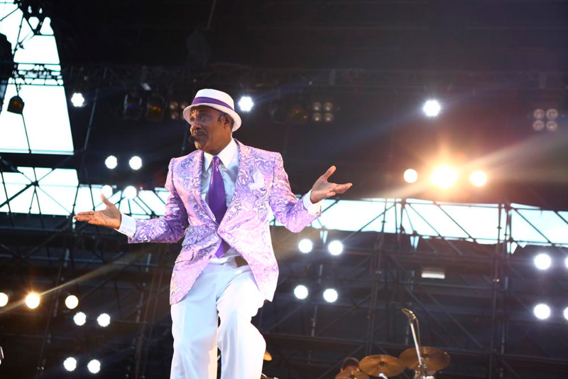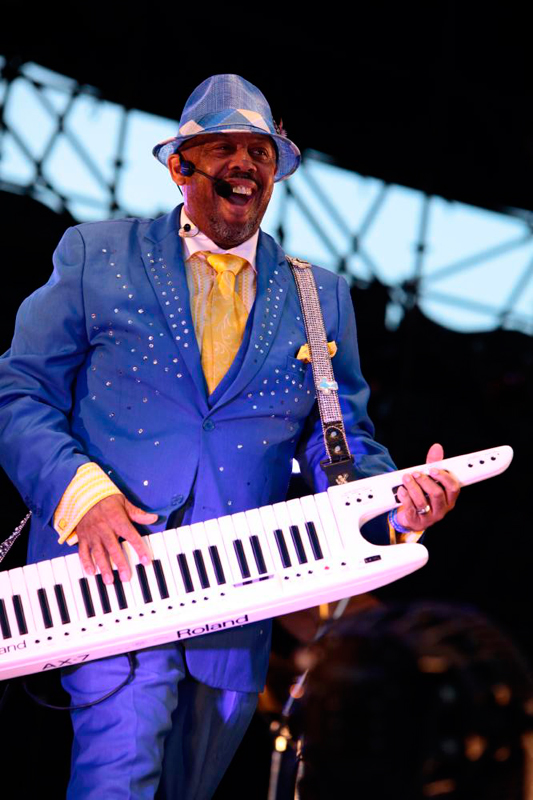 先ほどのステージでも「大ファン」、「大きな影響を受けた」と語っていたタキシードの二人がステージ脇で見つめるなか、バトンを受け取ったザップは、イントロからテンションMAXのダンスをかまし、「So Ruff So Tuff」でのっけから見事なコール&レスポンスを披露。さらに名曲「Dance Floor」からドラムソロでマーク・ロンソンの「アップ・タウン・ファンク」を挟み(「ザップ・タウン・ファンク・ユー・アップ」と歌っていたように聞こえたが。)、「I Heard It Through the Grapevine」を畳み掛け一気にオーディエンスの心を鷲掴みに。メンバーは入れ替わり立ち代わりステージを出捌けし、楽器を持ち替え、衣装を替え、時にはスピーカーの上に登ってコール&レスポンスを見せるなど、広いステージを縦横無尽に動き回り息つく間もない圧巻のエンターテインメントショーを繰り広げていく。中盤は「Computer Love」、「Be Alright」、でクールダウン。紫に染まった空にメロウかつエモーショナルなスロー・ナンバーが心地よく響き渡った。サム・スミスの「Stay with Me」も披露するあたりはさすがというか、ステージに立つものとしてオーディエンスを目いっぱい楽しませようという心意気を強く感じた。ラストはファンク・シーンのみならずヒップホップシーンでも大ヒットとなった「California Love」で再び会場を熱いパーティータイムに持ち込み、初めての人もそうでない人も大満足の観ても楽しい、聴いても楽しいパフォーマンスを見せつけてくれた。