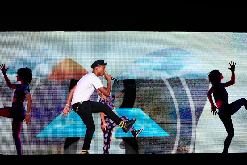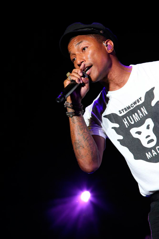 2日目のMARINE STAGEのトリは9年ぶりの来日となったファレル・ウィリアムス。会場は、アリーナ、そしてスタンドの上の方までぎっしり人で埋め尽くされており、近年の音楽シーンを賑わせているファレルの人気っぷりを物語っていた。大声援の中、ダンサーを引き連れて登場すると、最新シングル「Freedom」からライブはスタート。1曲目からファレルのファルセットなシャウトを全開。オーディエンスも両手を空に突き上げ、それに呼応した。この日は、大ヒットアルバム『G I R L』からのナンバーはもちろん、ネプチューンズ、N*E*R*Dといった自身の長いキャリアから選ばれた豪華なセットリスト。ライブ中盤では、「Spaz」、「Lapdance」、「She Wants To Move」などN*E*R*Dの曲を立て続けに披露した。ダンサーのショータイムをはさみ終盤に入ると、ファレルが参加し世界的大ヒットとなったロビン・シック「Blurred Lines」、ダフト・パンク「Get Lucky」が続き、オーディエンスは疲れも忘れてさらに踊り続ける。そして、お待ちかね「Happy」が流れ出すとステージには大勢の子供たちが登場し、ファレルと共にステージ上でダンスやハイタッチ。ファレル自身も笑顔がこぼれ、9年ぶりのステージを楽しむ様子に、会場全体が文字通りハッピーな空気に包みこまれた。ラストは再び「Freedom」を力強く歌い上げ、花火と共に2日目のフィナーレを飾った。