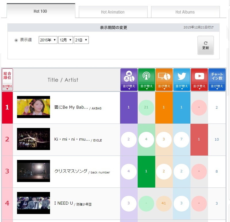 ――はい。CDとデジタルのセールスとストリーミング回数、ラジオの放送回数、ルックアップ(CDのPCへの取り込み回数)、Twitter、さらに6月からはYouTubeを合算して1つのチャートにしています。新サービス「Chart Insight」では、指標ごとに並び替えるなど、複合チャートの中身をより詳しく見てもらうことが出来ます。例えば「YouTubeで今週、何が一番再生されたか?」とかですね。