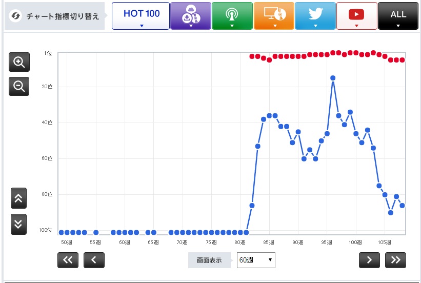 ▲「千本桜」推移。赤がYoutube、青がHot100の順位。