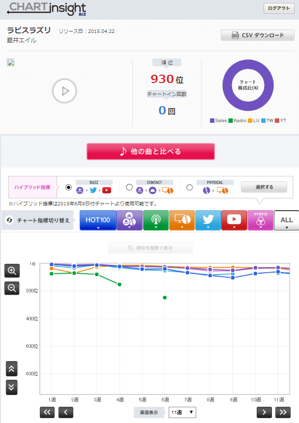 −−ちなみに、私達は毎週のチャート発表以外に、チャートインしてから現在までを折れ線グラフで表す「チャートインサイト」というサービスを展開しています。例えば、「ラピスラズリ」は、セールスのポイントも高いですが、ルックアップのポイントもとても高いので、若い層に人気が高いこと、持ち歩きたい、カラオケで歌いたい曲なんだなということが見えてきます。