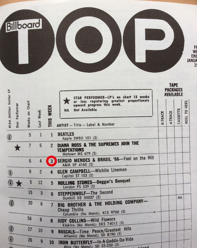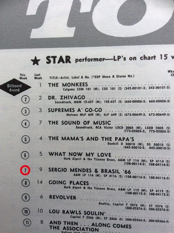 A&M第二のアーティストとして同レコードが大プッシュしたのがセルジオ・メンデスとブラジル’66だ。「セルメンをヨロシク」と、RSFCのスタッフたちにもプロモーション。彼らのシングル「マッシュ・ケ・ナダ」(最近は“マッシュ・ケ・ナーダ”と表記されているけど、50年近く前からの慣習はなかなかもどらない)は66年後半から67年初頭にかけてスマッシュ・ヒット。TBSラジオ“POPS BEST 10”67年1月8日付で最高位8位を記録した。
