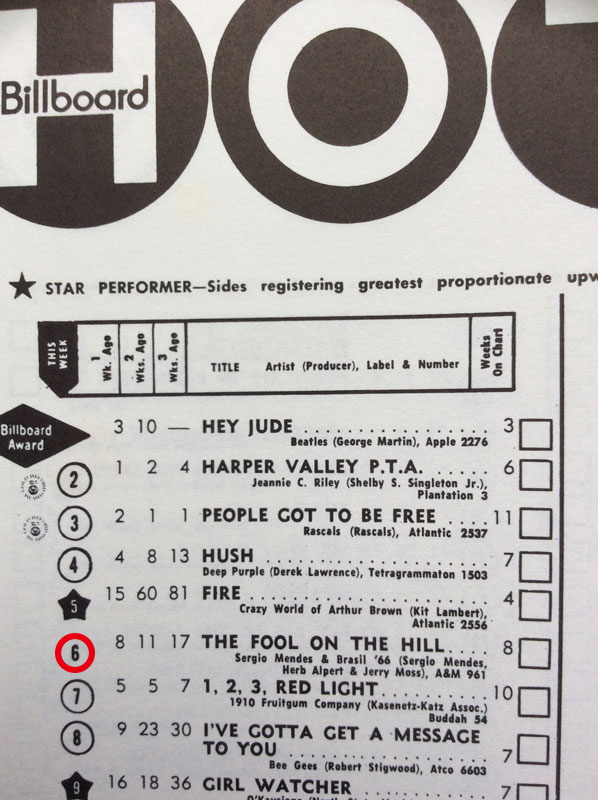 ところでビートルズ・カバーといえば、アメリカで彼らの3枚目のゴールド・ディスクとなった68年作品集「フール・オン・ザ・ヒル」はずばりB4ソングから。LPからのファースト・シングルもアルバム・タイトル・ソング。シングル「フール・オン・ザ・ヒル」はHOT100で「恋のおもかげ」に続くTOP10チャート・イン・ナンバーとなり、HOT100では68年9月28日付で最高位6位を記録(TBSのPOPS BEST 10では68年12月22日付から3週3位)。アルバムの方はTOP LP’s69年1月11日付3位がベスト・ランク。
