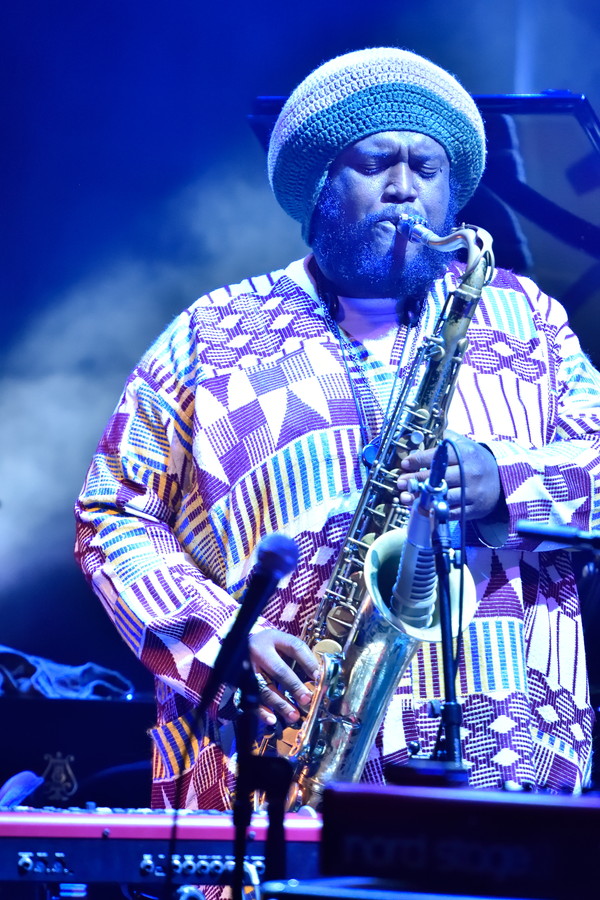例えば、ギターのサミル・ムレイはファンクマナーで前に出てソロを弾くというよりはカッティングでリズムに徹する場面が多かったが、時折エフェクターを切り替え、空間系のエフェクトをたっぷりかけたサウンドをサイケデリックに彩っていたあたりはインディー・ロック的なセンスを感じたし、ドラムのロバート・ミラーは、ファンクビートの中にも、ゴスペル由来の現代ジャズ~生演奏ヒップホップ・スタイルのビートを織り交ぜていた。ジャスティン・ブラウンやロナルド・ブルーナーJrを思い起こさせるタムを効果的に使った重くて太いドラミングは、コンテンポラリー・ジャズ色の強い東海岸=NYの軽やかさとは違う、フュージョン系譜の西海岸=LAのドラマーのキャラクターを存分に楽しませてくれた。