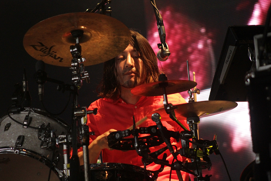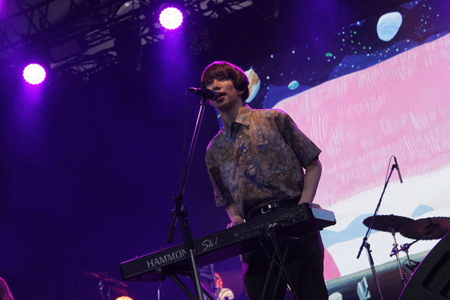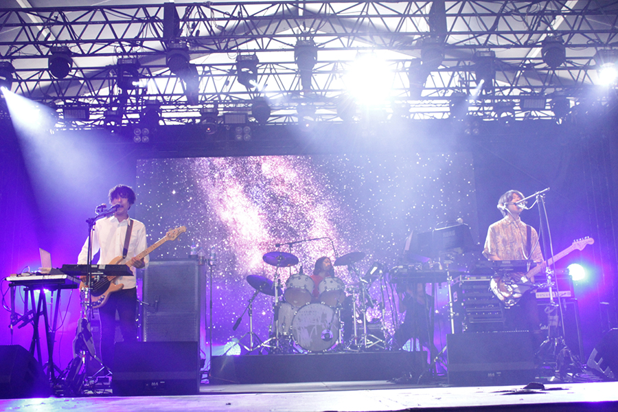 2日目の<レッド・マーキー>、トップバッターHomecomingsのシンプルなセットと対象的に、ステージに着々と組まれる数々のエフェクター、07年のルーキー出演からなんと9年を経てavengers in sci-fiが登場。今年4月にリリースした最新アルバム『Dune』より挨拶代わりに「Departure」で幕をあけた。今年もレッドには多くのバンドがエレクトロや同期を用いた楽曲で出演していたが、アベンズはすでに数年前からその領域に手をかけていた。「ルーキーステージ以来、9年ぶりなんです。よくも覚えてくれていたなと、ありがとう。」と随所に感謝の言葉を交えながら、ベックのリフを混ぜたりと楽しそうにプレイしていたのが印象的だ。「夏っぽい曲を」と、懐かしい「Sonic Fireworks」のイントロが流れると会場は大歓声に包まれ、9年ぶりのアベンズのフジのステージは「Vapor Trail」で幕を閉じた。