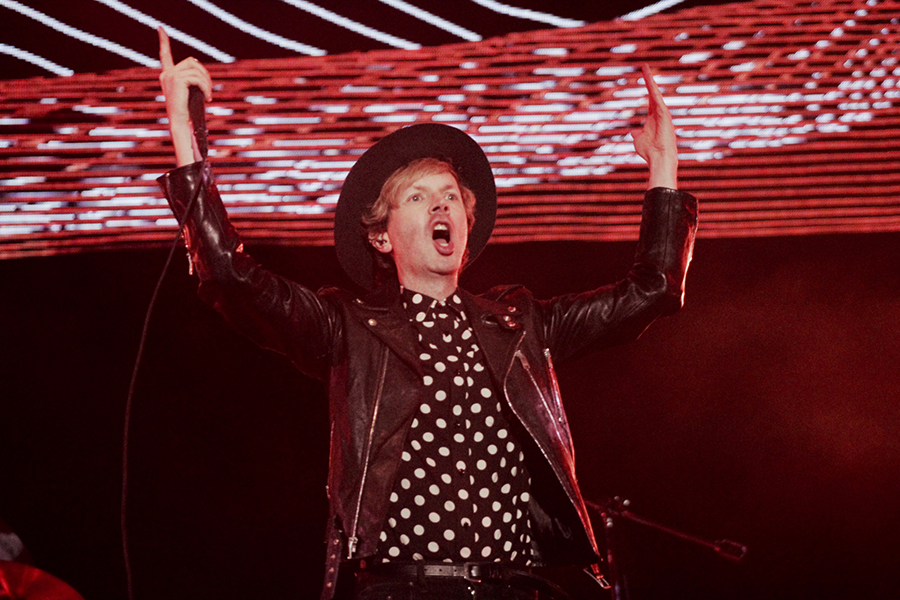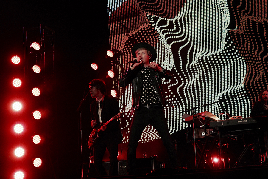 のっけから「Devil's Haircut」や「Loser」など立て続けにヒット曲を投下し、幾何学模様のサイケなプロジェクションなどフェス仕様のセットで<グリーン・ステージ>を巨大なダンスフロアへと変えていき、中盤「Lost Cause」や「Everybody's Got To Learn Sometime」(涙)とスロウなナンバーでクールダウンすると、「Sexx Laws」や「E-Pro」でシングアロングを煽り、アンコールでピンクのドット柄シャツ&白スーツに着替えて登場すると、観客のヴォルテージも最高潮に。「Think I’m In Love」ではドナ・サマーをさりげなく、「Where It's At」の間奏ではボウイ、プリンスやクラフトワークのカヴァーを盛り込むあたりも、やはりライブの盛り上げ方を熟知したベテランならではの遊び心。おじちゃんになって、ダンスに若干キレがなくなっている、なんて声も聞かれるけど、バナナシェイカーを振る姿さえも様になってました。ライブの内容に合わせて、ジェイソン・フォークナー、ロジャー・ジョセフ・マニング・Jr.、ジョーイ・ワロンカーらの所縁ある往年のプレーヤーたちをバンドに起用していたのも大納得。唯一残念だったのは、新曲「WOW」が披露されなかったこと。今秋の新作リリースとともに、近い来日での披露を期待したい。