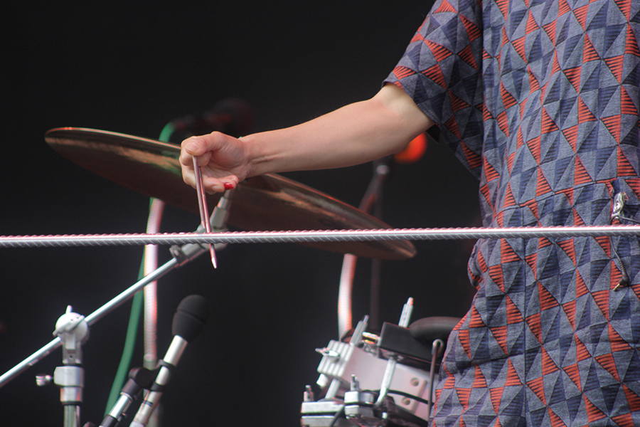 遠くに聴こえるレッチリのステージには見向きもせず、メンバー本人によるサウンドチェックを食い入るように見つめる熱心なファンたち。メンバーが一人づつステージに登場し、まるでパズルのように1から緻密に紡がれるループと強靭なドラムによるグルーヴがグイグイと観るものを惹き込んでいった「Dot Com」から、下手なダンス・アクトより観客を躍らせ、狂喜へ導いた「Atlas」、そしてラストの「The Yabba」まで、(いい意味で)一瞬たりとも気の抜けない、スリリングなライブだった。今回のステージを特に印象づけたのは、「IPT2」、「HI/LO」、「Tras 2」など初期の楽曲が、さらに繊密さと厚みを増し、最新作からの楽曲とシームレスに展開され、血肉化されていたこと。タイヨンダイ脱退から3ピースになって迷走中…、なんてささやかれた時期もあったが、それが完全に過去のものとなったのは一目瞭然だった。これぞバトルス、今こそがバトルスの絶頂期と胸を張って言える濃厚なステージで、バンドの真髄を見せつけてくれた。