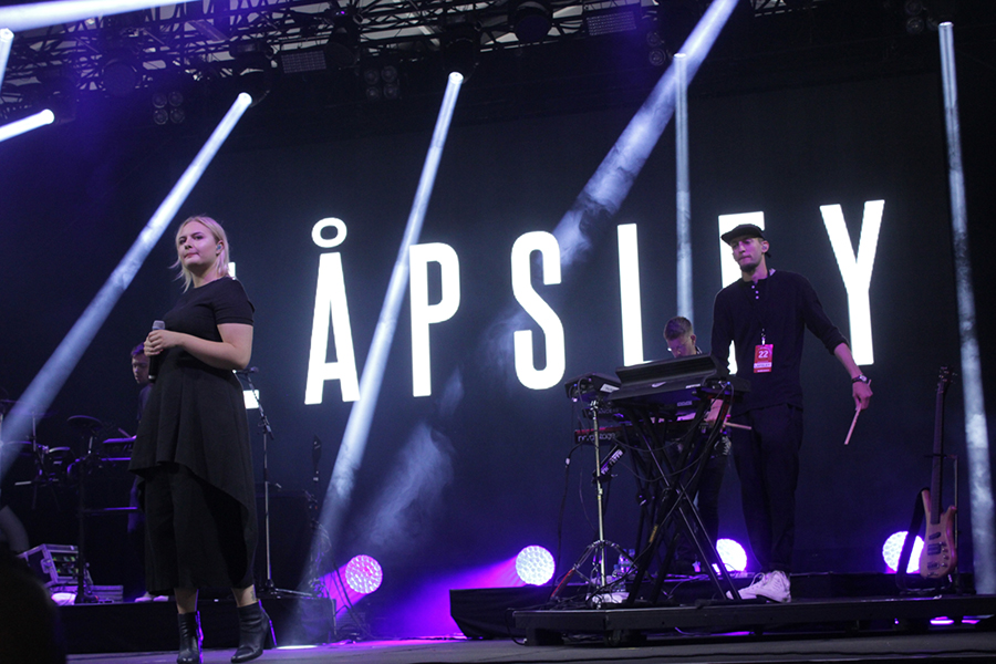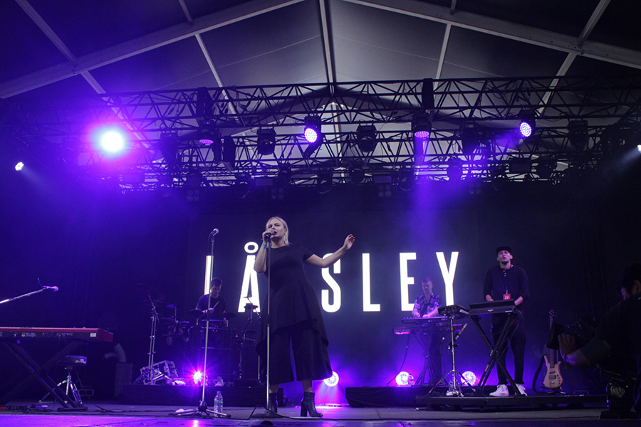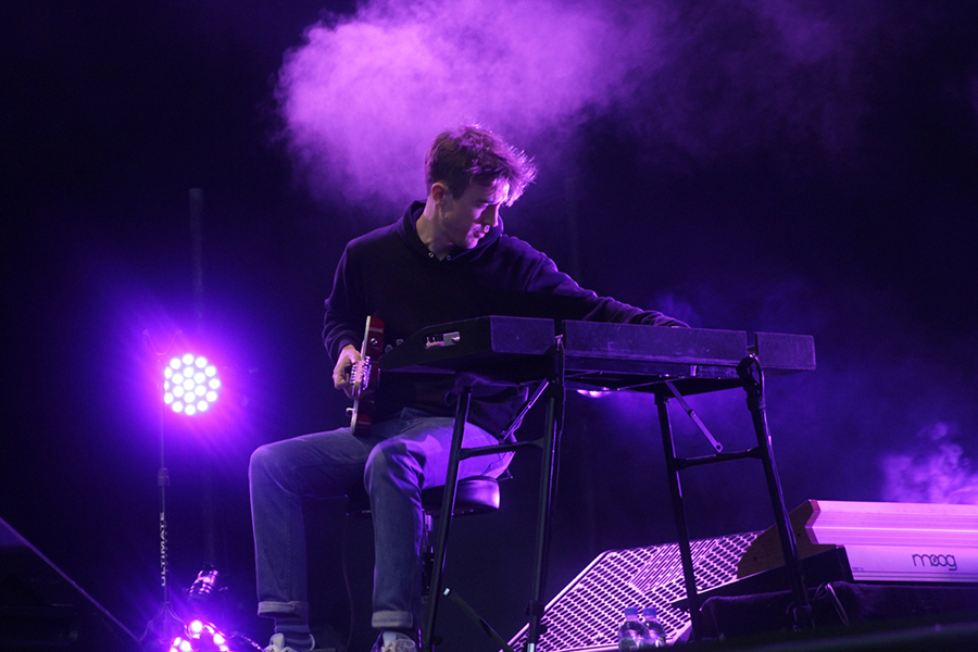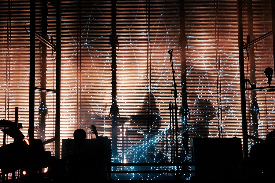 「Óveður」のイントロとともにどよめきが起こると、やや肌寒い夜空の下、ヨンシーの無垢な歌声が木霊する。冒頭の格子の演出、宇宙的なLEDプロジェクション、ドリーミーなスモーク、そして目を見張るようなライティングまで、すべてがシネマティックで堂々たるスケール。哀愁漂うゲオルグのベースラインとオッリの凄まじいドラミングの緩急なコントラストがスリリングな「Ný Batterí」、ヨンシーの伸びのある甘美なファルセットに息をのんだ祝賀的賛美「Festival」、ゲオルグがドラムスティックを用いてベースを演奏する、どこかオリエンタルでマントラ的な雰囲気が漂う「Hafsól」など、新旧バランスのとれたセットリストを展開。そして悲痛な叫びとともにヨンシーがボウを投げ捨て、まるで雪崩の如く音が溢れ出したラストの「Popplagið」は圧巻の一言だった。