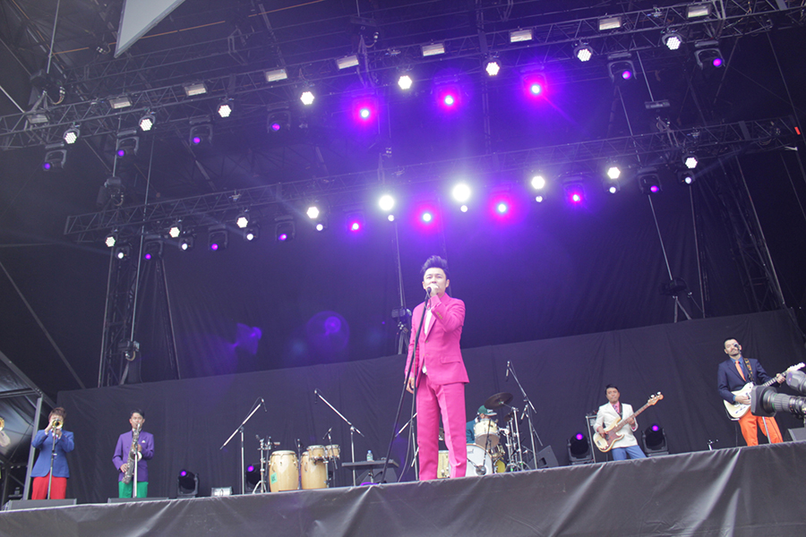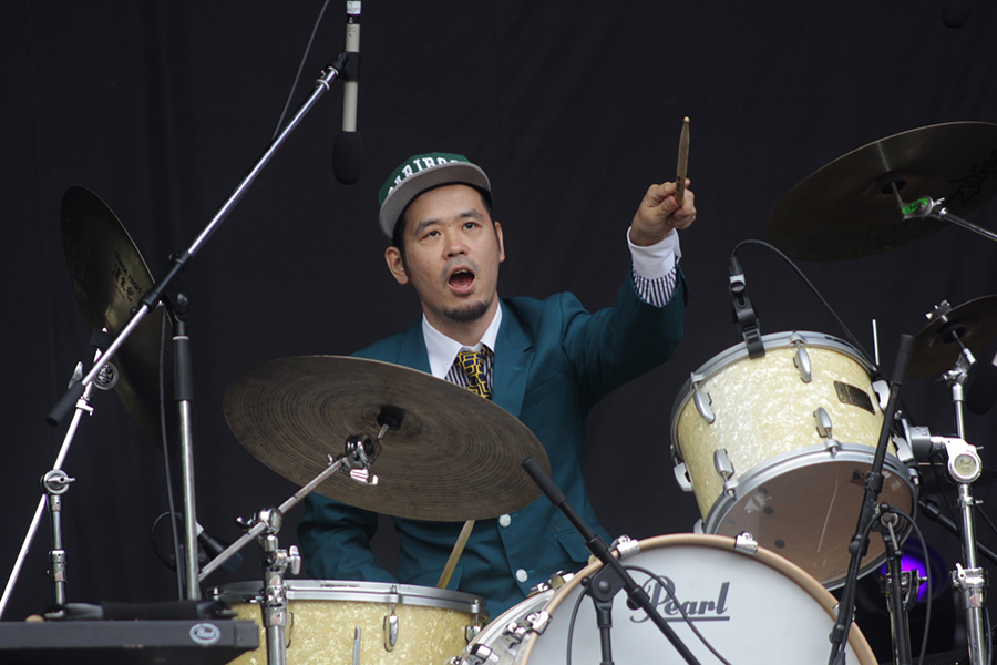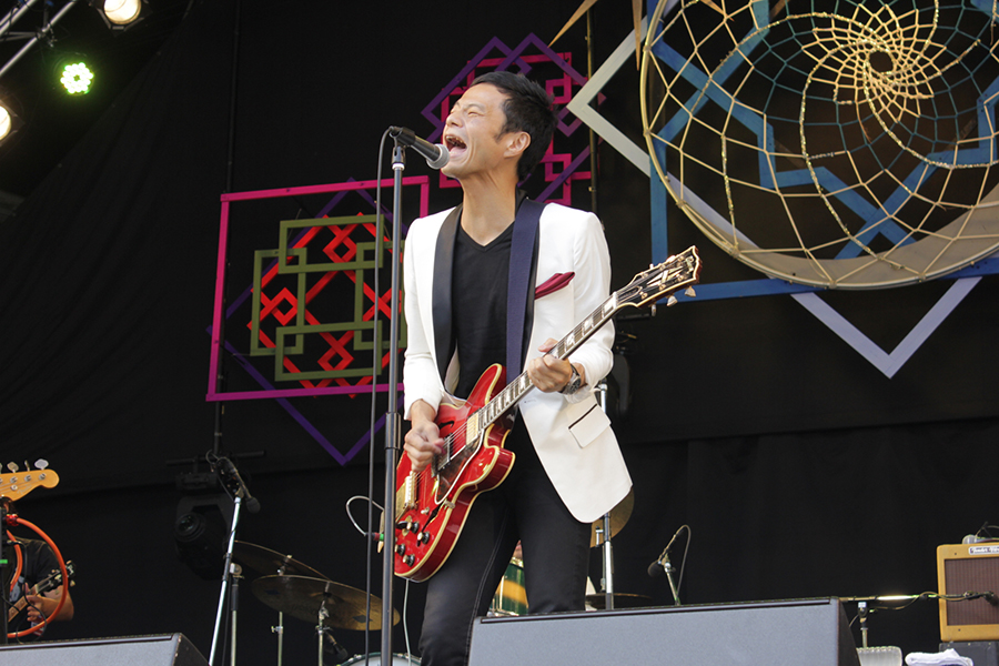 初日、<フィールド・オブ・ヘブン>のトップバッターは奇妙礼太郎。ソロの弾き語りのイメージの強い彼だが、バンドとしての初のステージが「今日このバンドの初めてのライブです。ひとつよろしく~」というMCの様に本当に初めてなようだ。メンバー全員白いフォーマルな出で立ちで放たれる泥臭いR&Rと、むき出しのエモーショナルな声で歌う新曲2曲は、ストレートに晴れたヘブンに染み渡った。ちょっとした「らしい」下ネタMCを挟み、切ない晩夏の思い出のような「最終電車」という曲を歌い上げ、既に配信されているソロ第一弾シングル「七色LADY」をバンドセットで披露し、最後はゲストに松井洋介が登場し、ブルースハープを奏でたり、歌ったりしながら、ヘブンらしいハッピーなグルーヴを生み出していた。奇妙礼太郎は9月に初のビルボードライブ公演が東阪で決定している、どんな新しい奇妙くんを見せてくれるのか今から楽しみである。