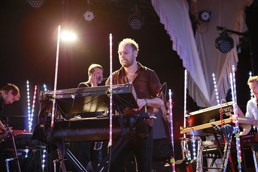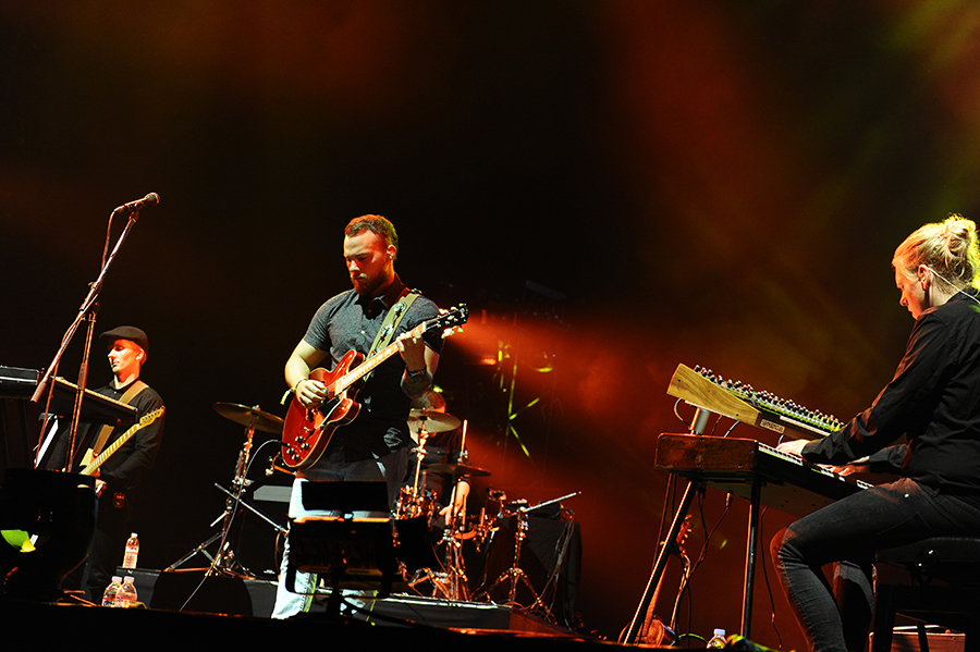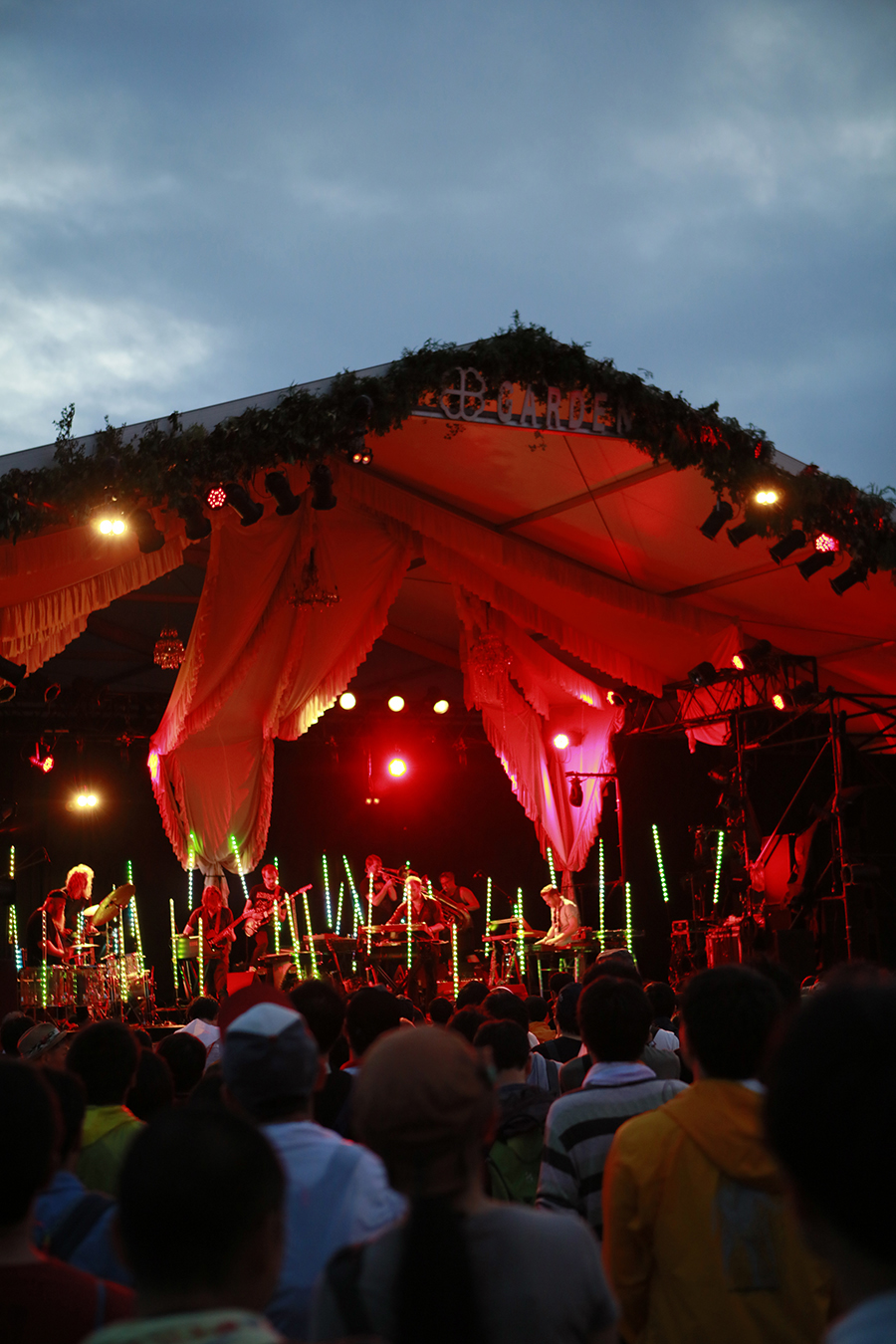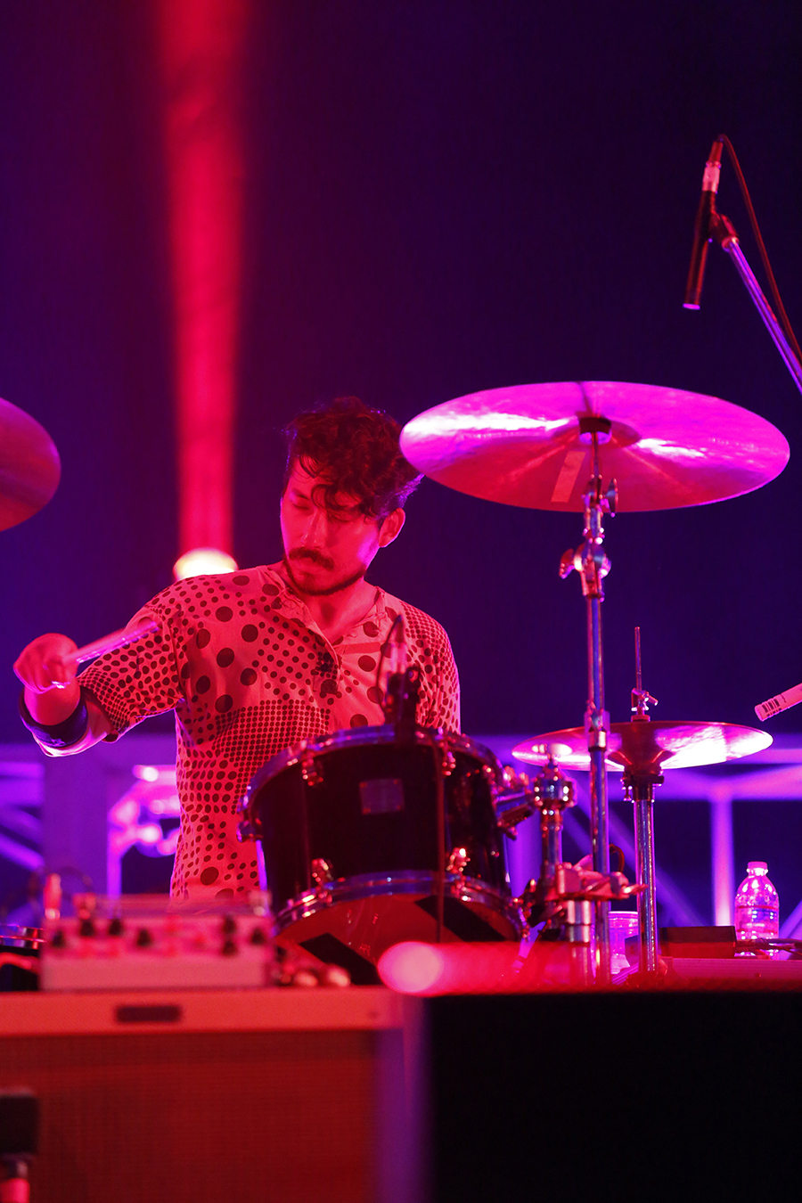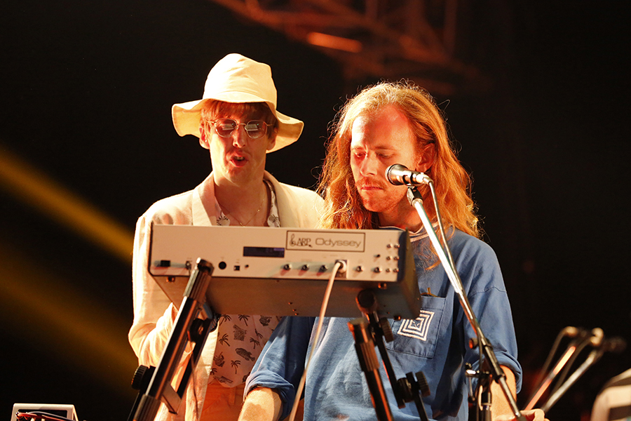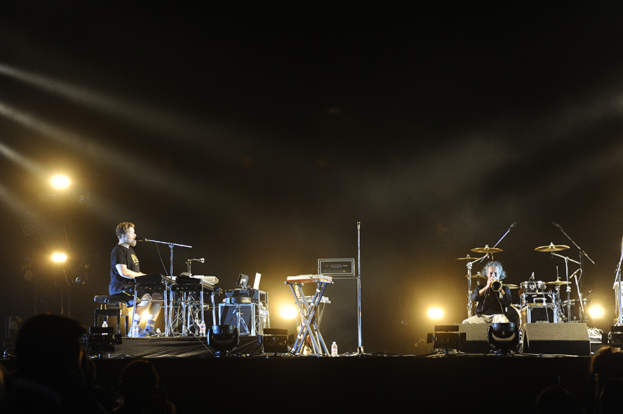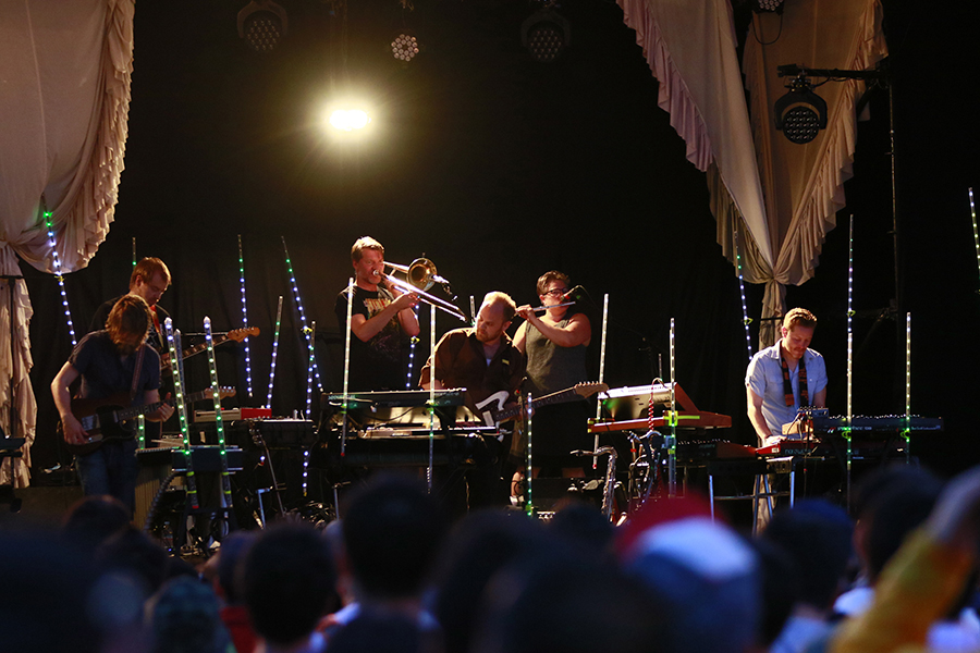 “エクスぺリメンタル・ジャズ”というと、いささか小難しい印象だが、浮遊感溢れるグルーヴ、北欧ならではポップネスと鉄板のバンド・アンサンブルで、前日から降り続いた雨のせいで沼化したガーデン・ステージを巨大なダンスフロアへと変えたジャガ・ジャジスト。レインボーに輝く無数のライトと楽器に埋め尽くされたステージ上。メンバー全員による入念なリハを経て、昨年リリースされた最新作『スターファイアー』から「Big City Music」でライブがスタート。ギター、ベース、管楽器、シンセサイザー、ドラムが緻密に組み立てる、緩急がある変則的なリズムとグルーヴに自然と体が動いてゆく。メンバーも次々と楽器を変え、万華鏡のようなカラフルなサウンドスケープが、まるでジェットコースターのように展開。赤毛&髭がトレードマークのドラマー、マーティンによるMCとメンバー紹介をはさみ、ラストは「Oban」で終了。50分間で計4曲という短いセットだったものの、夕暮れのガーデン・ステージは、何ともいえない高揚感に包まれていた。