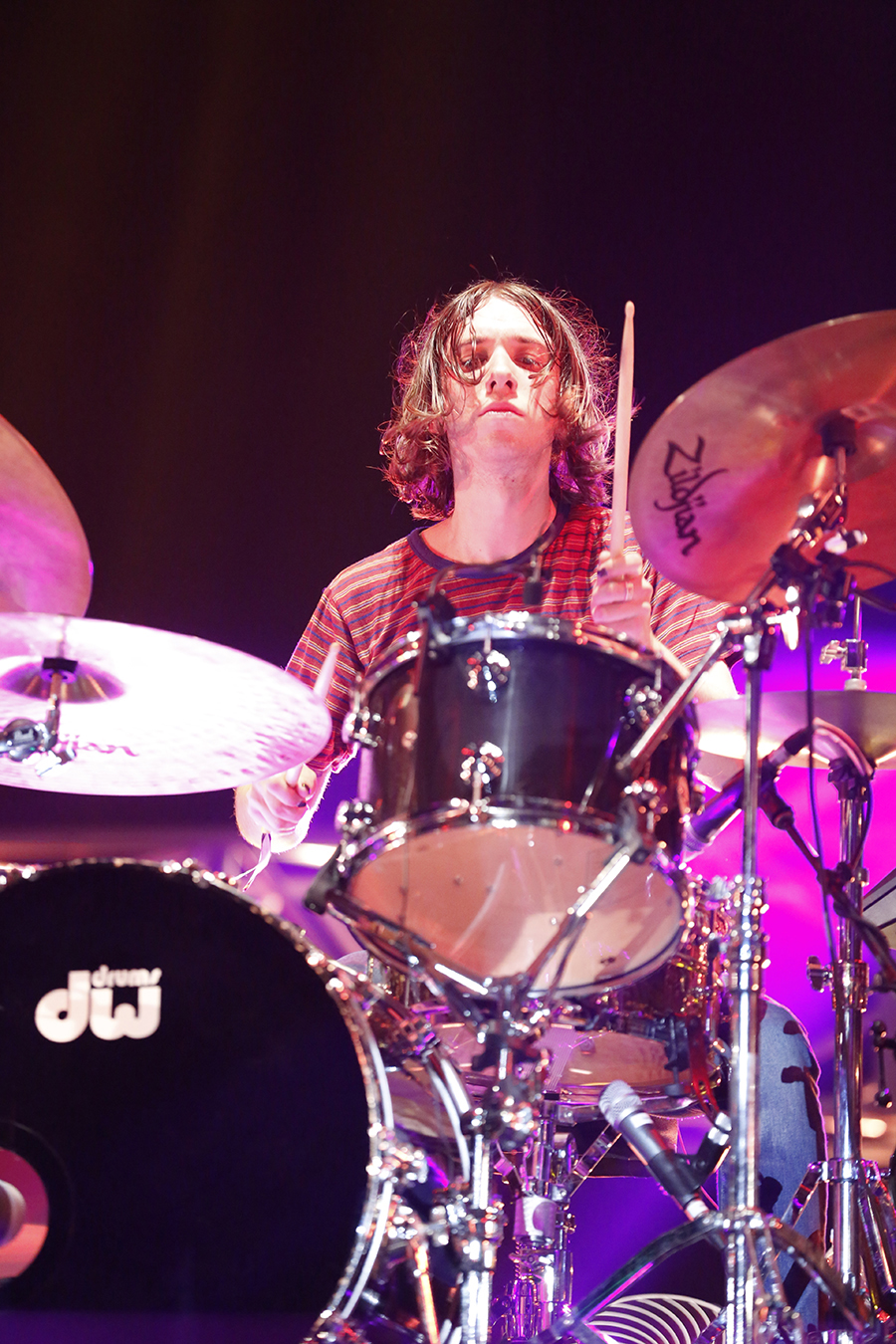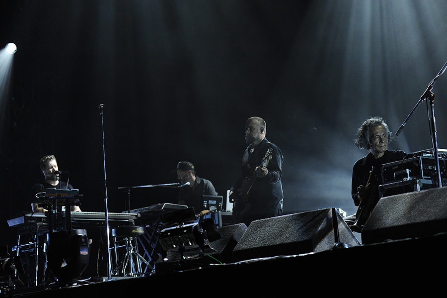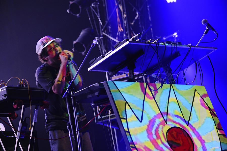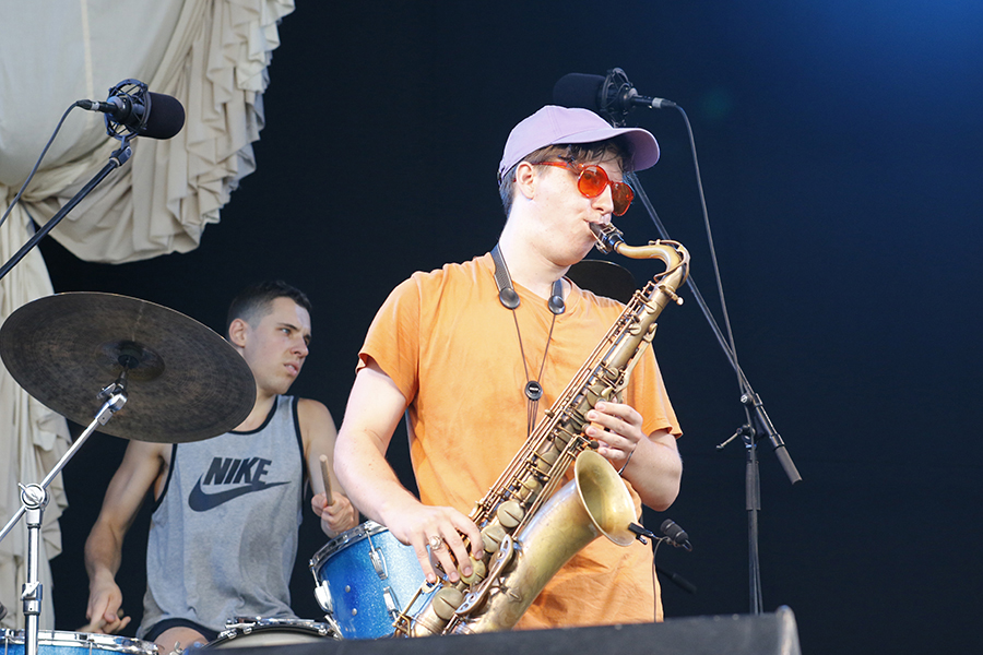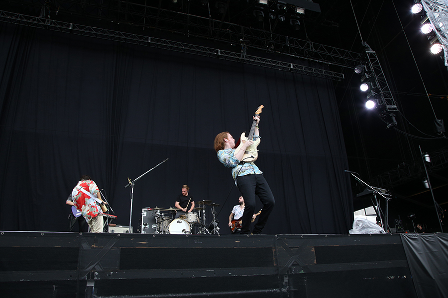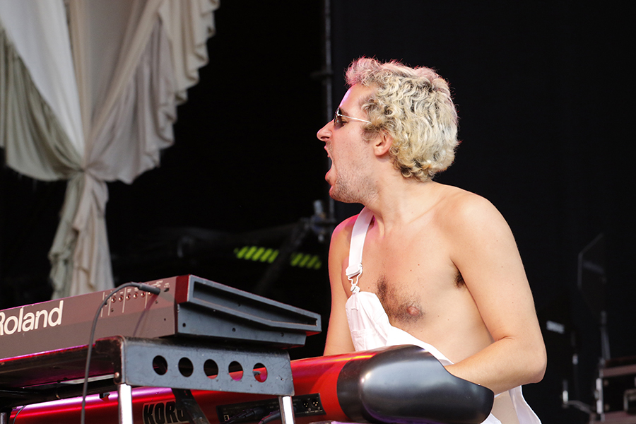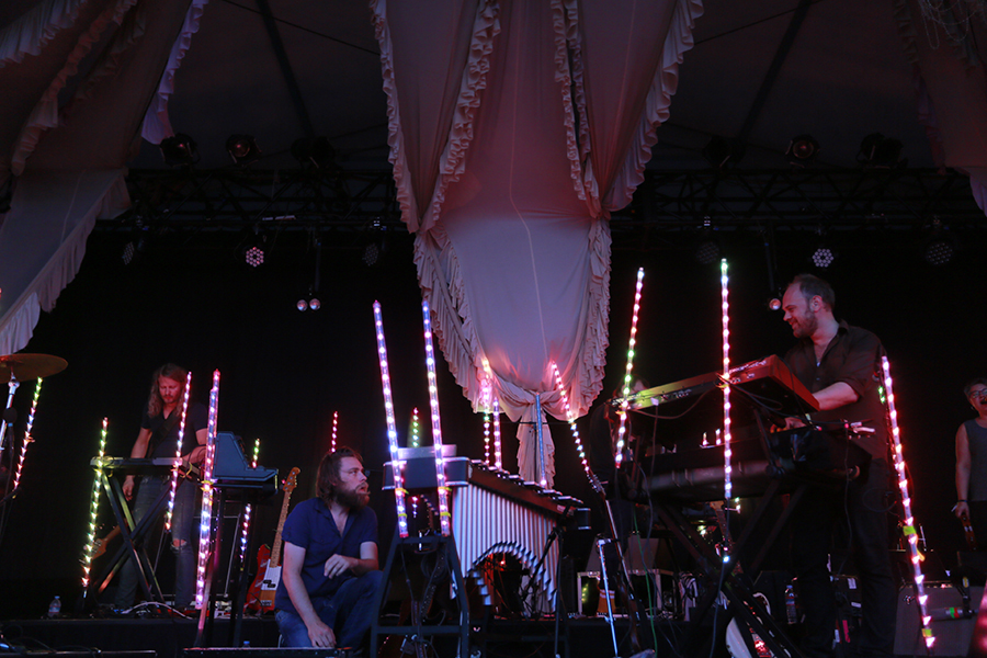 “エクスぺリメンタル・ジャズ”というと、いささか小難しい印象だが、浮遊感溢れるグルーヴ、北欧ならではポップネスと鉄板のバンド・アンサンブルで、前日から降り続いた雨のせいで沼化したガーデン・ステージを巨大なダンスフロアへと変えたジャガ・ジャジスト。レインボーに輝く無数のライトと楽器に埋め尽くされたステージ上。メンバー全員による入念なリハを経て、昨年リリースされた最新作『スターファイアー』から「Big City Music」でライブがスタート。ギター、ベース、管楽器、シンセサイザー、ドラムが緻密に組み立てる、緩急がある変則的なリズムとグルーヴに自然と体が動いてゆく。メンバーも次々と楽器を変え、万華鏡のようなカラフルなサウンドスケープが、まるでジェットコースターのように展開。赤毛&髭がトレードマークのドラマー、マーティンによるMCとメンバー紹介をはさみ、ラストは「Oban」で終了。50分間で計4曲という短いセットだったものの、夕暮れのガーデン・ステージは、何ともいえない高揚感に包まれていた。