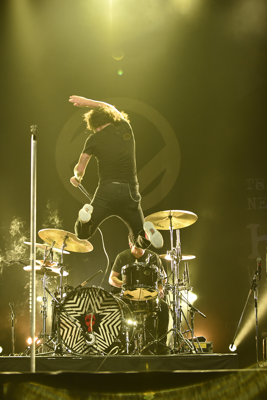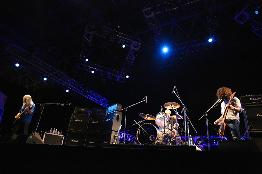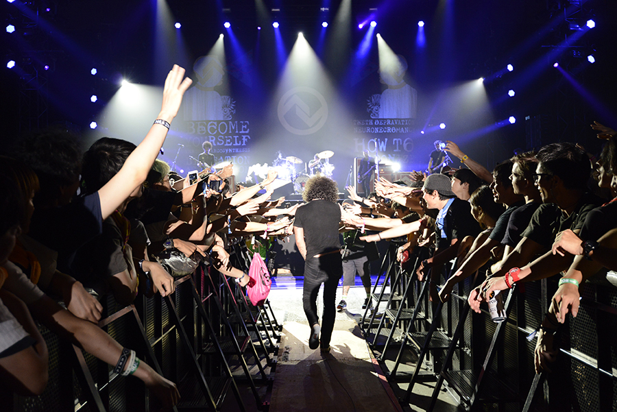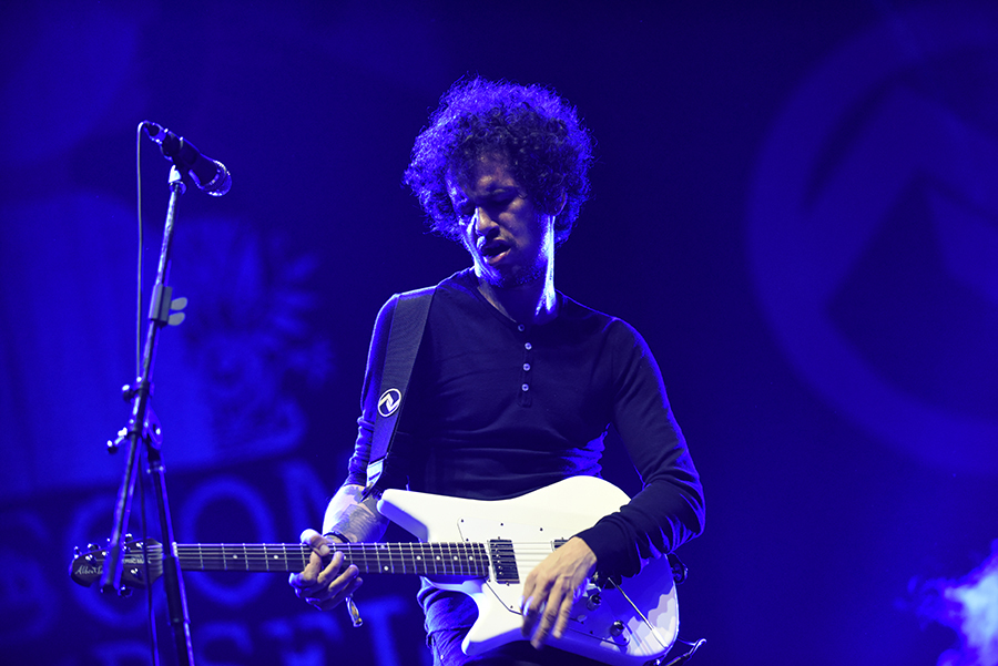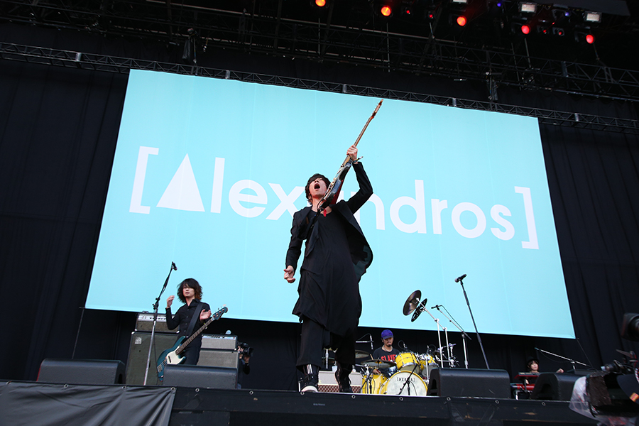 この日のソニックステージのトリを務めたのはアット・ザ・ドライヴイン。「アークアーセナル」、「パターン・アゲインスト・ユーザー」と、3rdアルバム『リレーションシップ・オブ・コマンド』の冒頭2曲が披露されると、ステージにはラウドで叙情的なサウンドが響き渡り、彼らの抑えられない、というよりも抑える気のない激情が、早くも観客を巻き込み渦巻いていた。バンドのアフロツートップ、セドリック・ビクスラー(Vo)とオマー・ロドリゲス(Gt)のキレにキレまくったパフォーマンスも冴えわたる。続く「スリープウォーク・カプセル」では、日本で話題となった“例の空耳”大合唱も起こり、その後も、3rdアルバムの楽曲を中心に、熱量の大きいショーが展開される。アット・ザ・ドライヴイン完全復活宣言ともいえるようなステージだった。