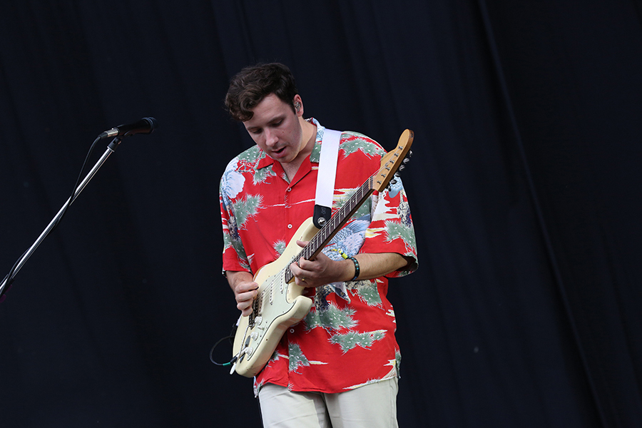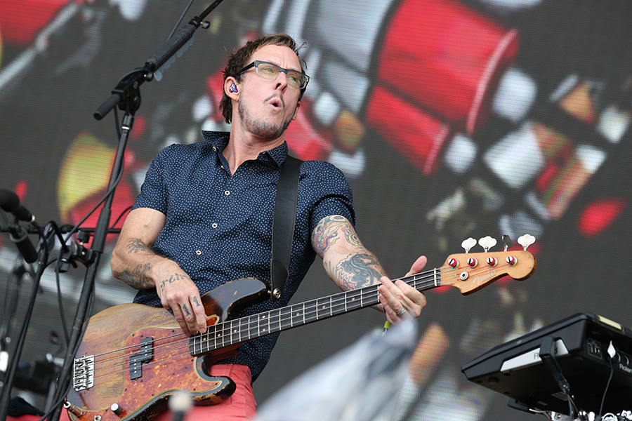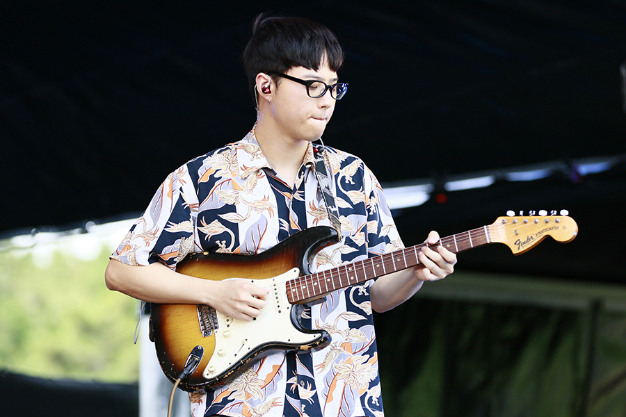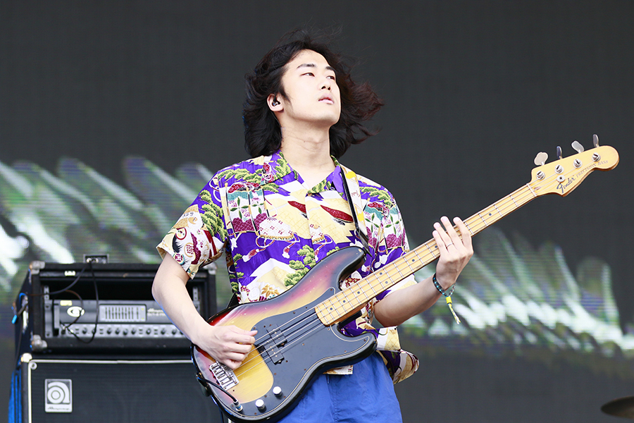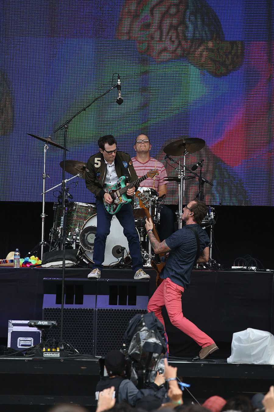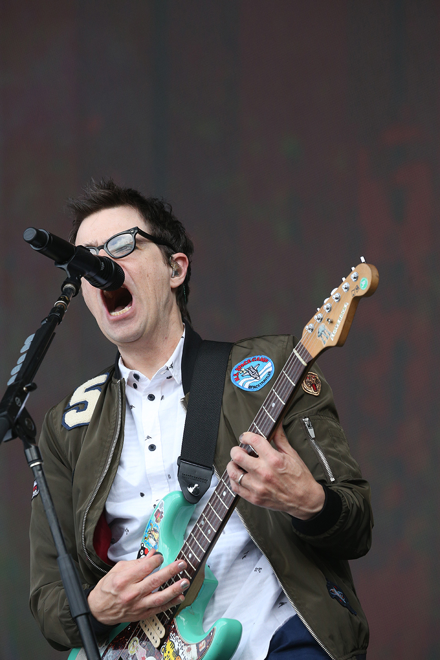 先日、満員の新木場スタジオ・コーストにて単独公演を行ったウィーザーがマリンステージに登場。同公演でもそうであったように、最新作の楽曲を中心にというよりも代表曲を惜しみなく披露していくセットリストで、観客も名曲の数々を噛みしめるように受け止める。ミドル・バラ―ド「パーフェクト・シチュエーション」では、リヴァース・クオモ(Vo&Gt)が、自身の娘ミアを引き入れ、キーボードとして参加せるといった、微笑ましい親子共演の場面も。中盤では、多くの国外アーティストが「トーキョー!」と呼びかける中、正しく「チバ―!」と叫んだ米ポップ・パンクバンド=アリスターのフロントマン、スコット・マーフィーがゲスト出演し、最新作『ウィーザー(ホワイト・アルバム)』のオープニングナンバー「カリフォルニア・キッズ」を、日本語歌詞バージョンで披露するなど、日本への愛を感じるような演出も嬉しいステージだった。