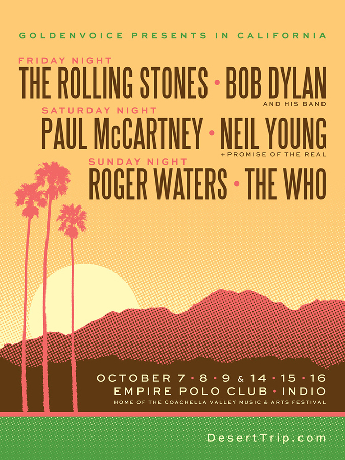 歴史的な野外フェス【Desert Trip】の舞台となるのは、現シーンにおいて世界最高峰のフェスのひとつ、コーチェラ(・ヴァレー・ミュージック・アンド・アーツ・フェスティバル)がおこなわれているアメリカ・カリフォルニア州のインディオにあるエンパイア・ポロ・クラブ。1年以上の構想と調整を経て決定したという同フェス開催のニュースは、多くの音楽ファンにとって2016年春の一大トピックとなった。まず最初にファンを驚かせたのが、その告知方法。実は少し前から同フェスについては少しずつリークされはじめており、ニュースになるたびに熱心な音楽ファンの間で話題となっていた。しかし、あまりにも豪華すぎるラインナップであることから、その信憑性を疑うファンも決して少なくはなかった。