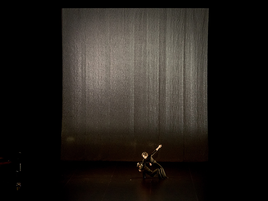 オープニングセレモニーでは、本フェスティバルのディレクターを務める首藤康之と細尾真孝のコラボレーションが行われた。まず、細尾が登場し本フェスについて「岡崎を中心に伝統工芸とアートがコラボレーションする新しい音楽祭が始まります」と挨拶。そして、これから始まるオープニングプログラムについて、美しさを追求するという意味で共通する西陣織とダンスのコラボレーションという新しい挑戦だと述べた。場内が暗転しステージの幕が上がると、今回の公演のために制作された長さ15mにもおよぶ西陣織が登場。そして、その西陣織を纏った首藤康之が、新作「BROCARE」を披露した。ダンスに合わせて西陣織は複雑に色を変え、首藤も巨大な西陣織に負けない存在感で客席を圧倒した。続いて、ピアニストの福間洸太郎も加わり、「Prelude for Didi&Gogo」、「Scriabin’s Etude」、「GLASS」の3作を披露。最後に、背景の巨大な西陣織がステージ上に落下する演出には、思わず客席からも息をのむ声が。まさに、ダンスと西陣織という、2つの芸術のコラボレーションが時空を越えた瞬間だった。