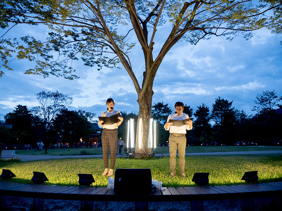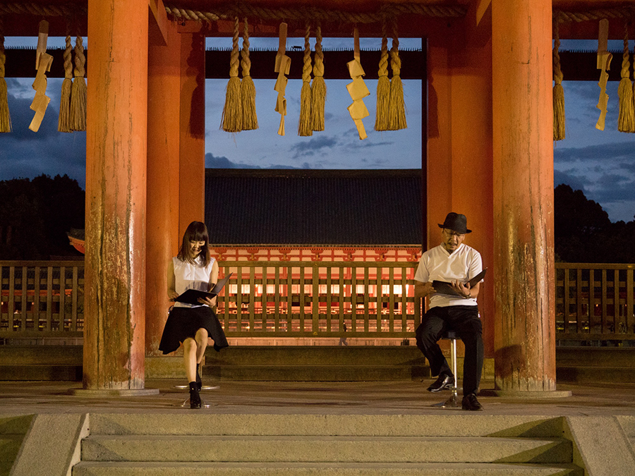 大吉洋平&藤林温子(MBSアナウンサー)、澤武博之&遠藤奈美(KBSアナウンサー)、佐藤弘樹&川原ちかよ(エフエム京都DJ)の3組が音楽にまつわる朗読劇を行うという無料イベント「READING THEATER」が、岡崎公園を中心に行われた。大きな特徴は出演者によって朗読劇の会場が異なること。一つの演目が終わる度に、京都府立図書館、岡崎公園、平安神宮と移動することによって、観客の中に不思議な一体感が生まれ、さらに偶然居合わせた人も加わることで、少しずつ観客が増えていくという体験型プログラムだ。ストーリーは、出会ったばかりの男女、付き合いたての男女、そして長い結婚生活を経た夫婦と、異なる年代の男女による恋愛物語。劇中には近隣の施設名が登場し、実際にその建物を見ながら朗読を聞くことによって、まるで実在のカップルの会話を思いがけず聞いてしまったかのようなスリリングさも感じられた。少しずつ暮れてゆく秋空と、3組の男女の時間の流れがリンクし、空の色、風の音、虫の音とともに、まさに一夜限りの舞台が繰り広げられた。