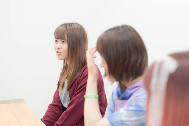 結城みゆ:すごくリアルな質問なんですけど、私はMCが苦手なんですよ。MCどうされていますか? 山田如凜:私、MC担当なんですよ。 結城みゆ:アドバイスしてほしい! 山田如凜:ライブ中にフリートークの時間ってあるじゃないですか。そのトークテーマをいつも事前にみんなで決めてます。そのテーマで私が話を振っていって、最後にまとめる。 得田あいり:じゃあ、上手いんですね。 山田如凜:いや、みんなによく「無理やりだね」って言われます(笑)。 結城みゆ:私がMC作ると「つまらん」って言われるんですよ。言われ過ぎてすごい悩んでるんですよ! また「つまらん」って言われるんじゃないかと思うと怖くなっちゃって(笑)。それでマジメなMCとかやってみたんですけど、ちょっとネタ入れると「それ、つまんない」って。あと、MC中に「謎かけやろう!」って思ったんですけど……--ハイレベル過ぎますよ(笑)。