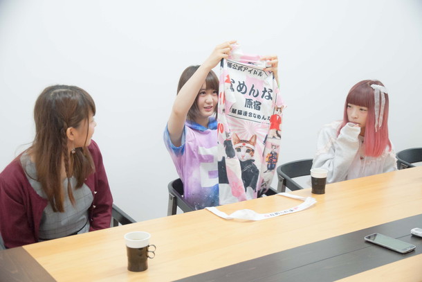 結城みゆ:蜂蜜☆皇帝は、岐阜発のメルヘンロックアイドルなんですけど、東京に遠征に来ると岐阜を知らない人が結構いて。だからまず岐阜を知ってもらいたいんです。なぜグループ名が蜂蜜☆皇帝かと言うと、岐阜には養蜂所がいっぱいあるからなんですよ。メルヘンロックアイドルは、女王蜂がロックロックしたやつが良いって言ってたんですけど、私ともうひとりがロックになりきれなくて「じゃあ、メルヘンロックにしよう」って(笑)。そういうアイドルが岐阜にいるということを全国に知らしめたくて頑張ってます。 山田如凜:DOPING BERRYは、りなはむが言ってる「ゆめかわいい」と日本の和。それを混合させた感じで、女の子からも「かわいい」って言ってもらえるような、いろんな人に観てもらえるような新しいジャンル感はあって。ライブも音楽もアイドルアイドルした王道ではないし、新しいものをこれからも作っていきたいなと思ってます。 得田あいり:なめんなよ原宿は、なめ猫公式アイドルグループだから衣装が学ランなんですよ。題名が「ざけんなよ」っていう曲もあって、それは一切笑わないで格好良く歌うんです。あと、ハチマキを着けてライブするんですよ。でも全力過ぎてほぼみんな取れてます(笑)。物販で売ってるTシャツも派手で全面なめ猫なんです。原宿のACDC RAGさんとのコラボ商品なんですけど……--今日は写真も撮ってるんで、せっかくだからハチマキもTシャツも着用しましょうよ。