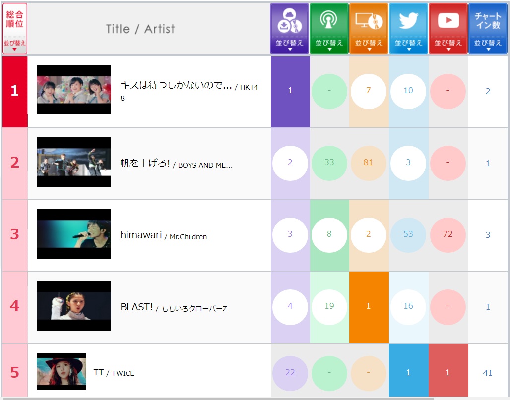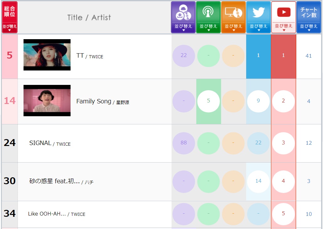 --それ以外にTwitter、YouTubeやGYAO!などの動画ストリーミングも合算して、一つのチャートとして発表しています。「Chart Insight」では、その中から指標毎に並び替えて調べてみることも出来ます。例えば、このチャートを動画の再生回数順で並び替えてみると、TWICEや星野源が上位に来ますね。