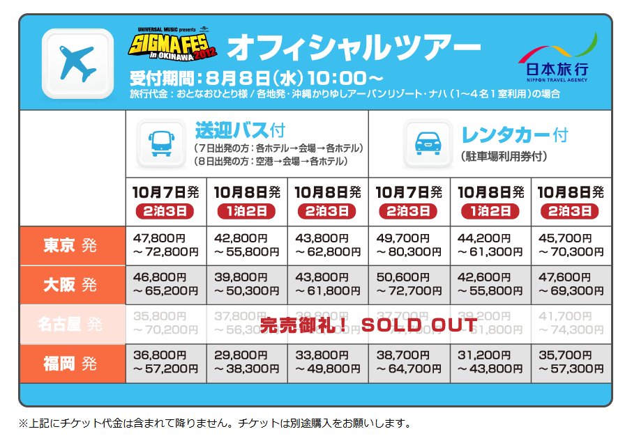さらに、今回のフェスでは1泊2日~2泊3日のオフィシャルツアーも話題に。既に一部完売となっているが、東京、大阪、名古屋、福岡から沖縄へ。ライブ会場までは送迎バス or レンタカーも付いてくる。豪華ライブを堪能しつつ沖縄を満喫できる、お得なプランとなっている。
