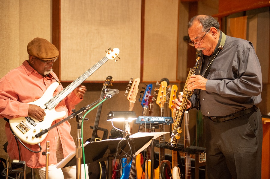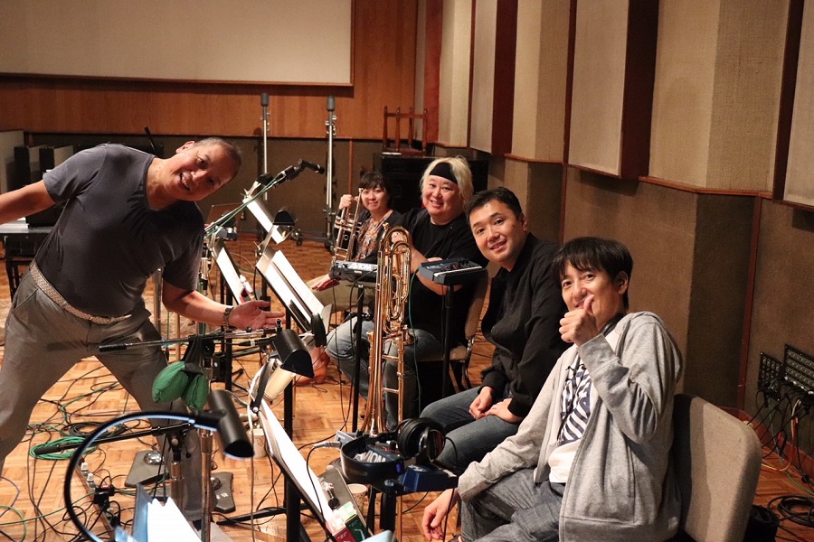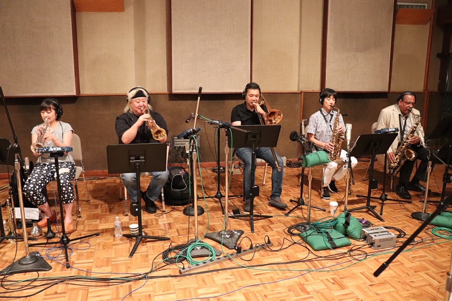まずは「Catwalk」から。日本人4人にアーニーが加わるという、まさに夢のホーン・セクションだ。スタジオ内でドンが指揮をし、5人のホーン・プレイヤーたちがタイトなアンサンブルを聴かせる。そのサウンドは元気いっぱいでパワフルだ。ベーシック・トラックでは、ハーヴィーやエイブラハムがとても自由でグルーヴィなリズムでプレイしているので、ホーン・セクションがそれに合わせてグルーヴし、さらにまとまったアンサンブルを聴かせなければならないという、実はけっこう難易度の高いミッションなのだが、それを難なくこなすのだから、やはりホーンのメンバーもただ者ではない。「彼らはプロフェッショナルだ」とドンも関心している。
