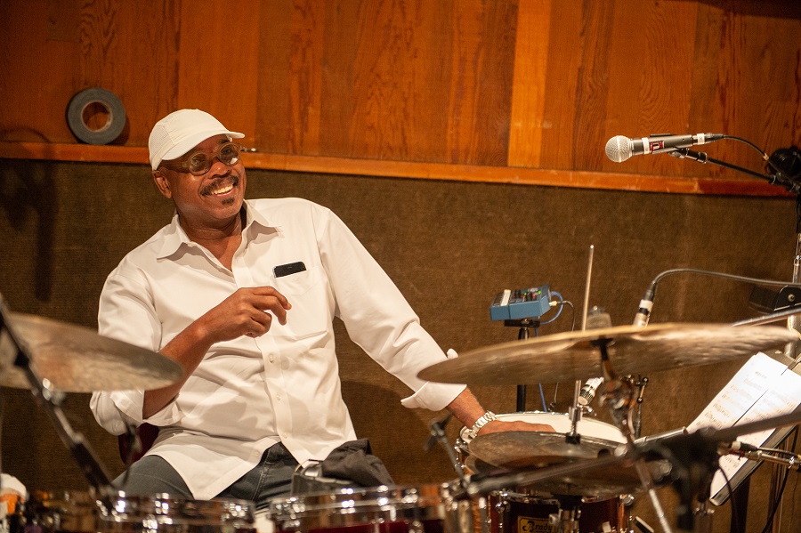 今日の1曲目は、エイブラハム作曲の「Holidays」。彼らしいカリプソ・タッチのハッピーな楽曲だ。エイブラハムが曲のイメージをメンバーに伝え、ウォーミングアップも兼ねてリハーサル、そしてそのまま本番へ。エイブラハムとハーヴィーの、ゆったりとしながらもグルーヴするリズムが実に気持ちいい。アーニーはソプラノ・サックスに持ち替えてメロディを軽快に歌っているが、これ、誰かが指示したのではなく、アーニー自身のセンスでチョイスしたそうだ。こういったところからも、彼らのこの作品に対する真剣な思いが伝わってくる。途中に出てくる超絶キメも、みんな難なく決め、エイブラハムとアーニーの掛け合いソロも気持ちいい。