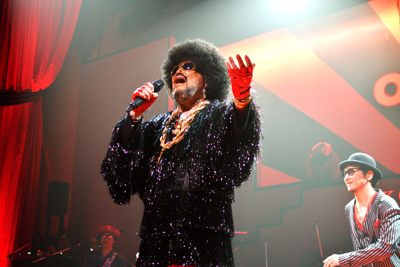 幕が上がると、そこには赤を基調としたド派手なステージとカールスモーキー石井、ジェームス小野田、SUE CREAM SUE、BIG HORNS BEEなど総勢16名のメンバーの姿が。オープニング・ナンバーは「NICE TO MEET YOU」。迫力満点のファンク・サウンドと“遊ぼよBABY”というコーラスが響き渡り、客席とステージの距離が一気に近くなる。さらに“セメテセメテセメテセメテ”“ヤメテヤメテヤメ”の掛け合いでお馴染みの「KOME KOME WAR」、ジェームス小野田の濃密なボーカルを軸にした「あ! あぶない!」とダンス・ナンバーを連発し、観客のテンションを引き上げる。ルーツ・ミュージックに根差した楽曲とブッ飛んだエンタメが共存したステージは、まさに米米CLUBワールドだ。