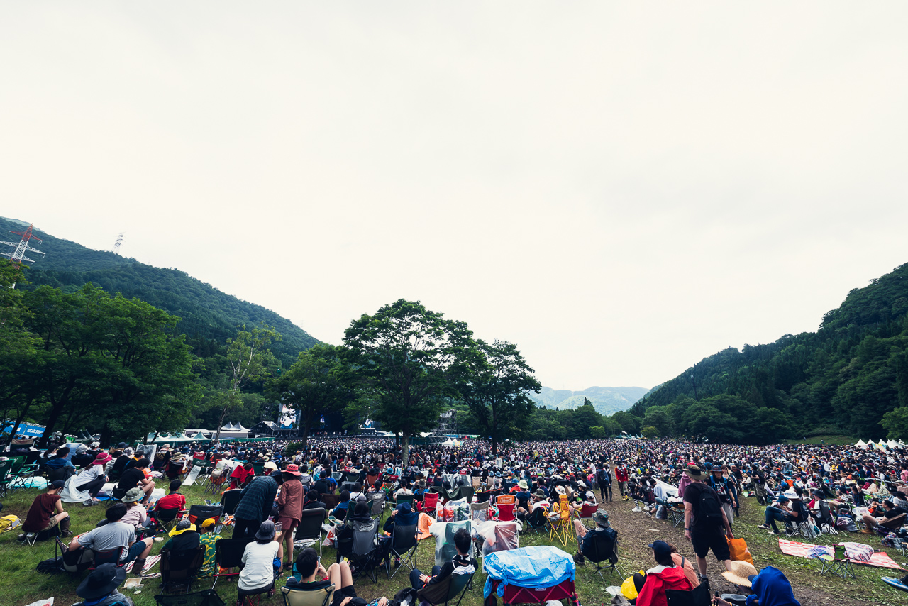 そう何度も実感した“ベースボールシャツのおじさん8人組”ソウルバンド、思い出野郎Aチームのステージは、フロントマン高橋が「ダサい掛け声!」と煽る「キープオンムービン!キープオンダンシン!」のコールでスタート。7年前にルーキーの出演を勝ち取った1曲「グダグダパーティー」だ。途中、“苗場の夜は君と”に歌詞を歌い替えると、すでにご機嫌なヘブンは一気に最高潮!そのまま抜群のグルーヴに乗せ、「Magic Number」を今夜苗場で聴けたら/森の中で一日中ライブを見ている「アホな友達」…と、この日限りの歌詞が次々飛び出し歓声が上がる。その度に苗場にいる喜びを噛み締めた。“売れないバンドマンの彼氏”を歌う「週末はソウルバンド」では「久々にデートかと思えば苗場でフジロックに来ているし、家賃を滞納しているのに三日間通し券は買えるのね」とアレンジ。うまい!を通り越しなぜか感動。