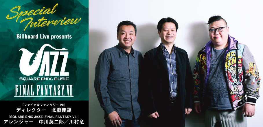 言わずと知れた不朽の名作ゲーム、『ファイナルファンタジー VII』。その中から厳選された人気楽曲が、“ゲーム音楽×本格JAZZ”を謳う「SQUARE ENIX JAZZ」シリーズでリリースされ、ビルボードライブでの公演開催が決定した。そこで今回は『ファイナルファンタジーVII』ディレクター北瀬佳範氏、本アルバムアレンジャーの中川英二郎氏、川村竜氏を迎えてのインタビューをお届けする。