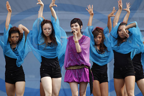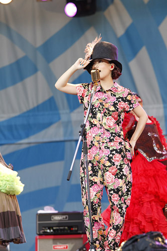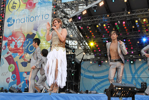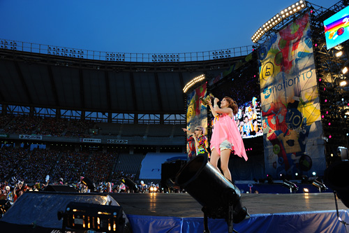 昨日に続き、会場の前には「倖田來未 トップバッターで登場」なる看板が設置されており、開演時間には見事な満席状態。そこへまさかのトロッコで登場した彼女。南国モード全開のセクシー衣装で会場中を回り、満面の笑みで手を振りながらヒットソングメドレーを展開し、凄まじい歓声を一身に浴びていた。そしてメインステージへ辿り着くと、突然「おかいもの♪」と某CMソングを歌い出し、みんなと大合唱。会場を見事ひとつにしたところで『キューティーハニー』をぶっ放し、5万人のハニーフラッシュを炸裂させる。更にはペットボトルの水を自らの体に振りまき、強烈なテンションを誇る歌声と動きで味の素スタジアムをダンスフロアに。最後はみんなでタオルを振り回しながら『With your smile』を披露し、今年最後の【a-nation'10】のスタートを華々しく切ってみせた。