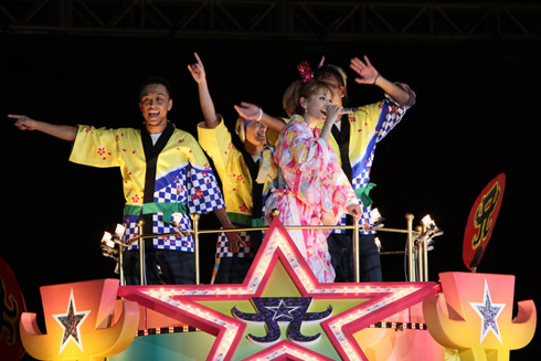 金ピカのスリット入りドレスでステージ下から現れるやいなや「どんだけ~~~~~!?」炸裂。そして「噂を信じちゃいけないよ」とイケメンダンサーとランバダ的なダンスを繰り広げながら、山本リンダ『どうにもとまらない』のカバーを全力で披露する。更には、自らのオリジナル曲『ゴージャスゥ~!』に淡い初恋とその相手を友達に取られちゃった悲哀を込めて熱唱。最後は「みんなありがとね~!どんだけ~!」とカツラを外しながら「終わり!」と、オーディエンスを圧倒したままステージを去っていくのだった。
