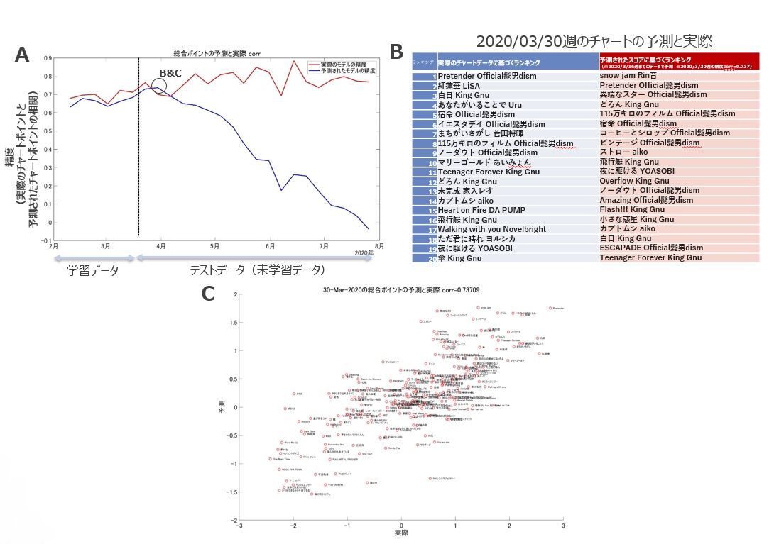 (A)チャートモデルによる予測(赤)とLSTMで予測されたモデルによる予測(青)の精度を、実際のチャートデータとの相関で示した。点線は学習データとテストデータの境界を示す。未学習のテストデータにおいても、4週間程度は精度が学習データと同様のレベルで維持されているが、それ以降は線形に下がっていった。(B)未学習データの2週間目時点である2020/3/30週の実際のチャートデータとLSTMで予測されたモデルによる予測のチャートのTOP20を示した。予測対象の楽曲は解析対象とした2020/5までの楽曲。(C)同じく3/30時点の実際のチャートデータとLSTMで予測されたモデルによる予測ポイントのプロット。精度は相関係数で0.737。