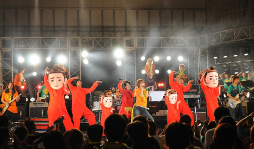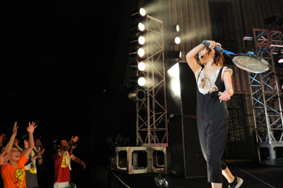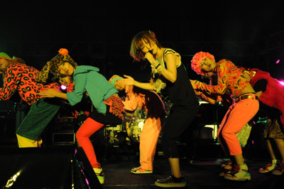 「いくぞぉぉぉぉ!!!」と、どこからともなくアッツい大さんの声が。そして「地球っこ~!!!」という叫び声と共に、ステージ中央に設置されていた地球の中から彼女が現れ「いくよぉぉぉぉ~!!!」と、改めて気合いをバンドとみんなと自分に注入。やがて誰もがその腕を振り上げ、ここにいる人の分だけの生命が爆発し、最高のオープニングを飾る。そして楽曲はノンストップで1stアルバム収録のちょっぴり懐かしソング『GIRLY』へ。こちらでは誰もが笑顔でジャンプ!ジャンプ!ジャンプ!みんなの気持ちをかる~く高いところまで引き上げていく。そして『H2O』で先の2曲に勝るとも劣らない超パワフルなエネルギーに満ちた声を響かせ、それに合わせてバンドも気合いの入った爆音を鳴り響かせ、会場を「うわぁぁぁぁ!!!」っと盛り上げる。
