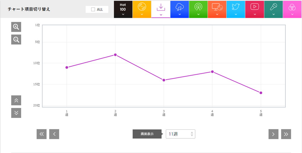 「VIVID VICE」のダウンロード指標のランク推移。2021年1月25日付に11位で初登場し、翌週2月1日付には8位に上昇、その後もトップ20圏内を維持している。