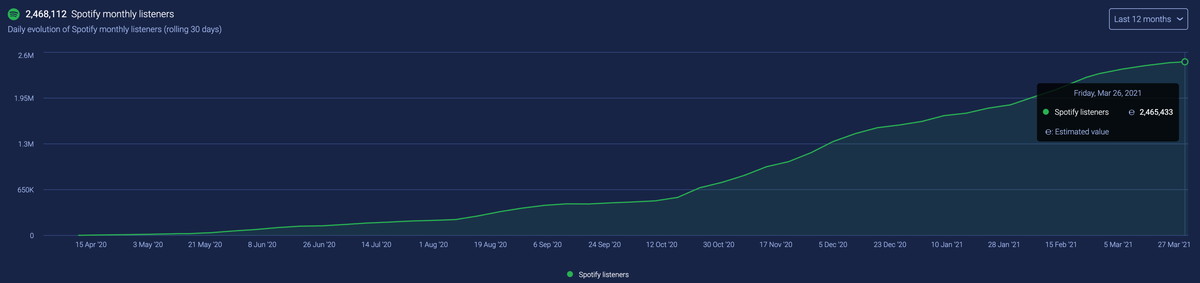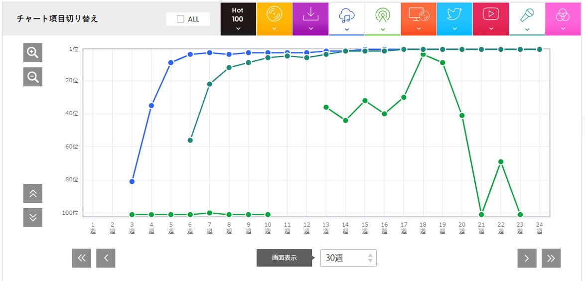 今年に入ってからは週間再生回数1,000万回を常に維持し、3月31日発表のチャートではついに10連覇を達成した。