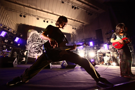 いきなり全身全霊の『レクイエム』で幕を開けたこの日のライブ。並々ならない気合いにオーディエンスは激しく体を揺らしながら、拳を空に向かって力強く振り上げていきます。また、松田晋二(dr)の「7年前に【夕焼け目撃者】というタイトルのワンマンをやりまして、それの2回目がこの日に開かれるということで。こんなにたくさんの皆さんに集まって頂き、本当にありがとうございます。心に残るような特別な夜にしたいと思っています」という宣言通り、野音が持つ特有の開放感のもと彼らは大暴れ。今までいくつもの狂乱を生んできた『墓石フィーバー』では真っ赤に染まったステージで激しく体をくねらせ、岡峰光舟(b)は今にもベースをぶん投げそうなアクロバティックなステージングで見る者を圧倒しました。