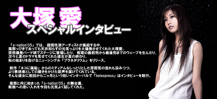 大塚愛(以下O):そうですね~。今回は『ネコに風船』をどうしても一番最後に持って行きたくって。いつも盛り上がって終わる感じで、それはそれでお祭りなんでアリなんですけど、私としてはあの曲の良さというか、感動できる部分を最後に持って行きたかったっていうのがあったんで。で、実際に盛り上がる曲で終わるよりも、『ネコに風船』で終わる感じの方が「あぁ~よかった!」っていう感じで帰れたりはしましたね。--そんな『a-nation'05』、大塚さんは風邪をひかれてしまいましたよね?始まる前から前兆はあったんですか?