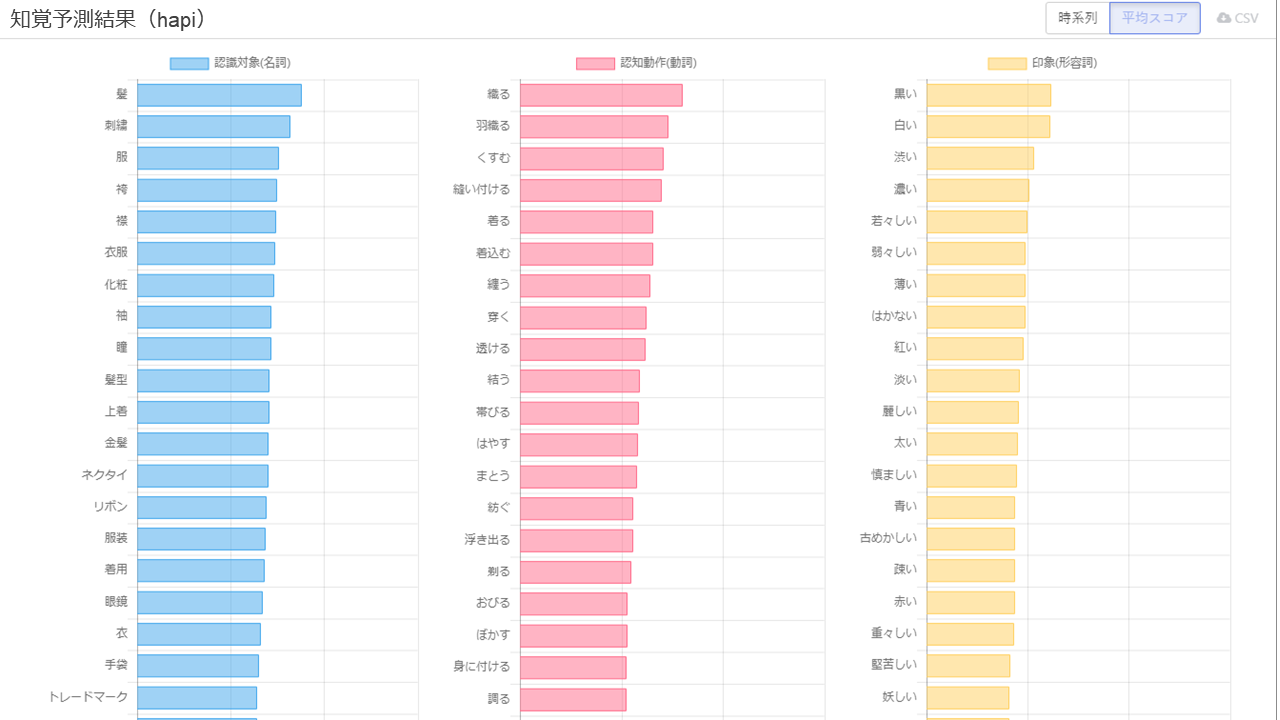 次に各パフォーマンス動画から人間の脳がどんな印象を知覚するかを予測してみる。まずhapi、麗奈、山下 優太郎の共通点として、名詞の最大知覚印象が「髪」となっている点が挙げられる。そのほかにも「服」「化粧」「瞳」「容貌」といった外見に関係するワードが多い一方、ざきのすけ。の予測結果を見てみると、名詞は「不明瞭」「不自然」「別人」、動詞は「ぼかす」「浮き出る」「ぼやける」、形容詞は「薄い」など、全体的にほか3人と違う印象を連想させるワードが多いのが特徴的だ。