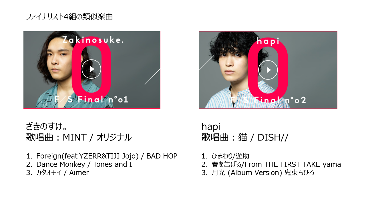 そのほか、DISH//の「猫」を歌ったhapiのパフォーマンスは、遊助「ひまわり」やyama「春を告げる」、平井大「祈り花」を歌った山下 優太郎のパフォーマンスは、BEGIN「島人ぬ宝」やUru「ドライフラワー」などと高い類似性を示した。