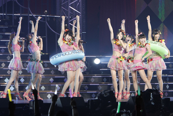 トップバッターの私立恵比寿中学がロックスター風の衣装で絶叫を轟かせれば、続く乃木坂46は持ち前のエレガントさを発揮。ぱすぽ☆がライブ必殺のチューンを並べて勝負に出ると、渡り廊下走り隊7は飛び道具的存在 浦野一美のMCで爆笑を呼び起こすなど、それぞれに特徴を活かした清々しいアクトで超満員の観衆を楽しませていく。